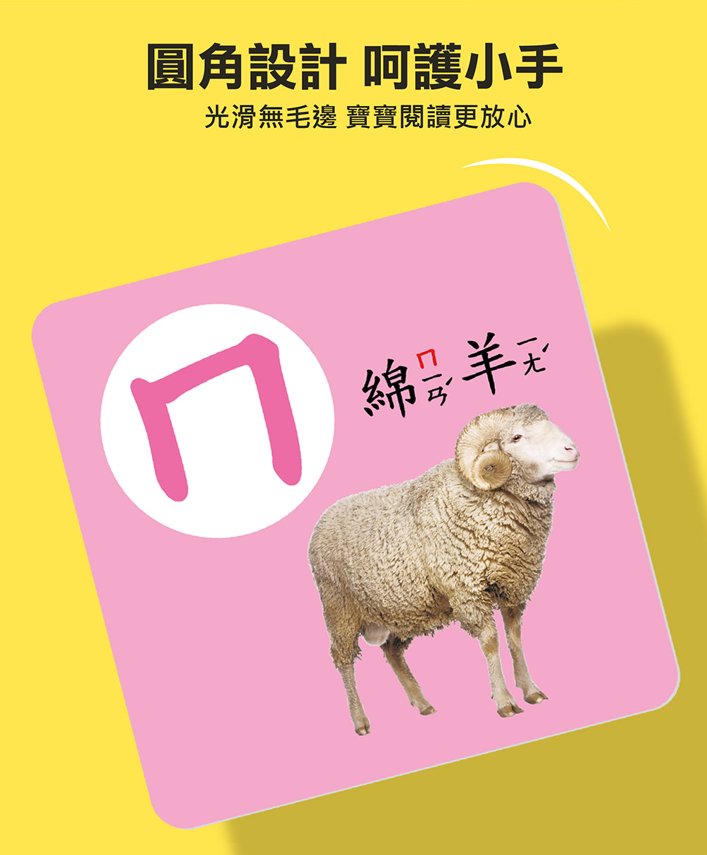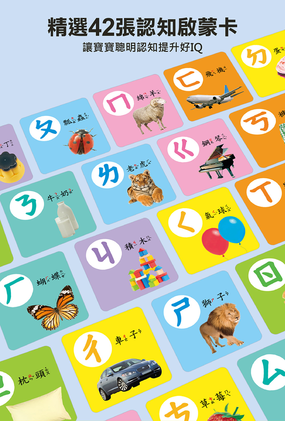 注音是學習中文的第一步,37個注音符號與相關詞彙寫實圖片,讓寶寶透過真實圖片認識37個對應的日常詞彙。