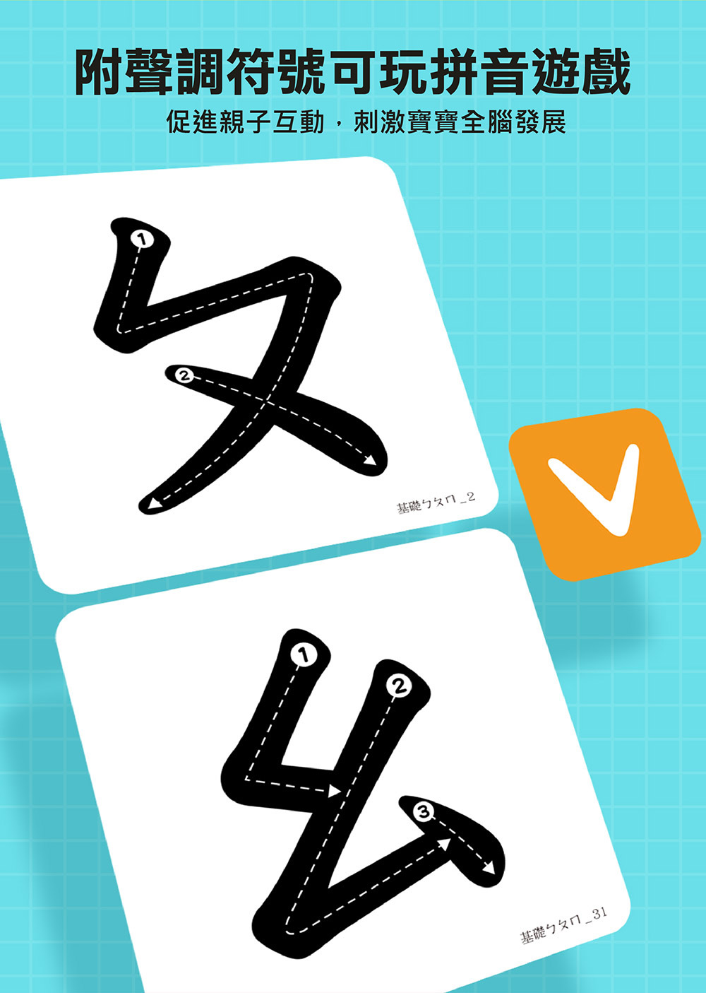 除了37個注音以外,還有簡易的拼讀遊戲,爸爸媽媽可以跟寶寶一起玩,促進親子互動,並刺激寶寶全腦發展。
