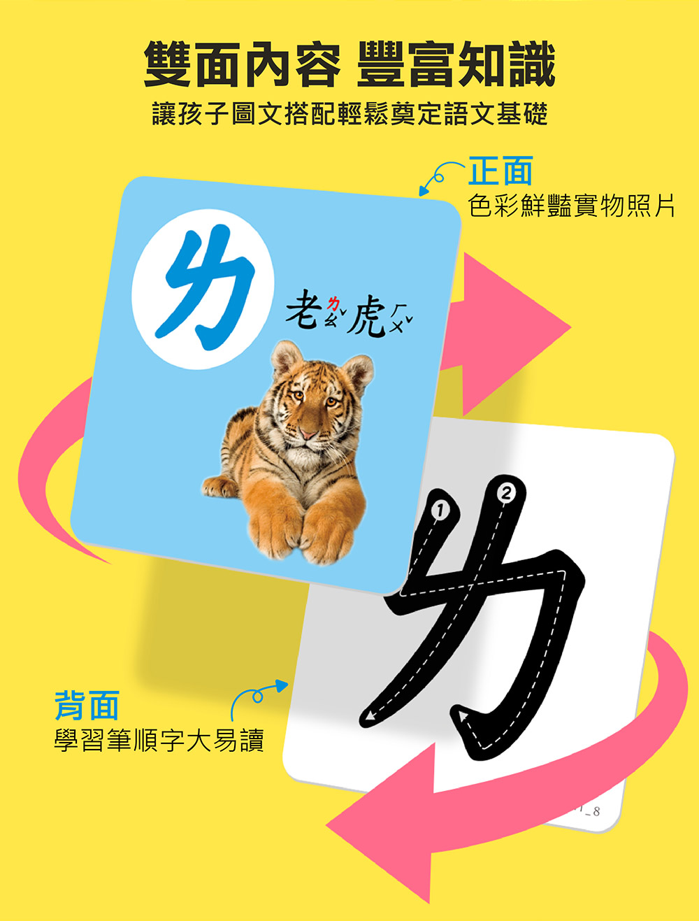 ★正面圖片附加相關詞彙、背面練習筆畫,讓孩子搭配圖文輕鬆學認知。