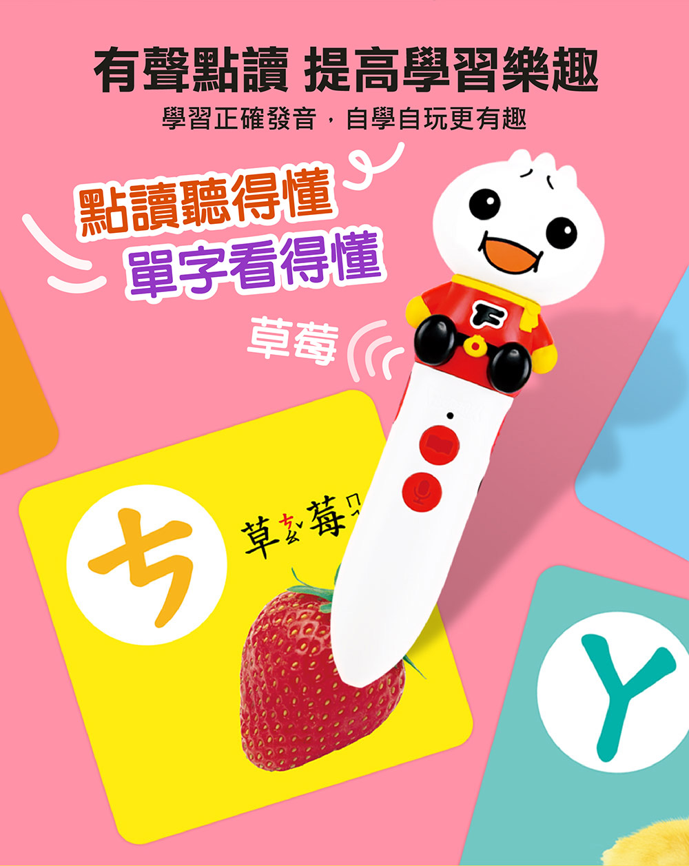 本產品可搭配《FOOD超人多重點讀筆》做點讀使用,單點圖卡背面會點讀注音符號,若點圖卡正面則能引導孩子學習該注音的對應詞彙及拼法。透過點讀功能,可以幫助孩子更深入的認識每一個注音與聲調,孩子可以在聽、看以及互動遊戲的過程中進一步將圖像與詞語相連結,並學習正確的發音。