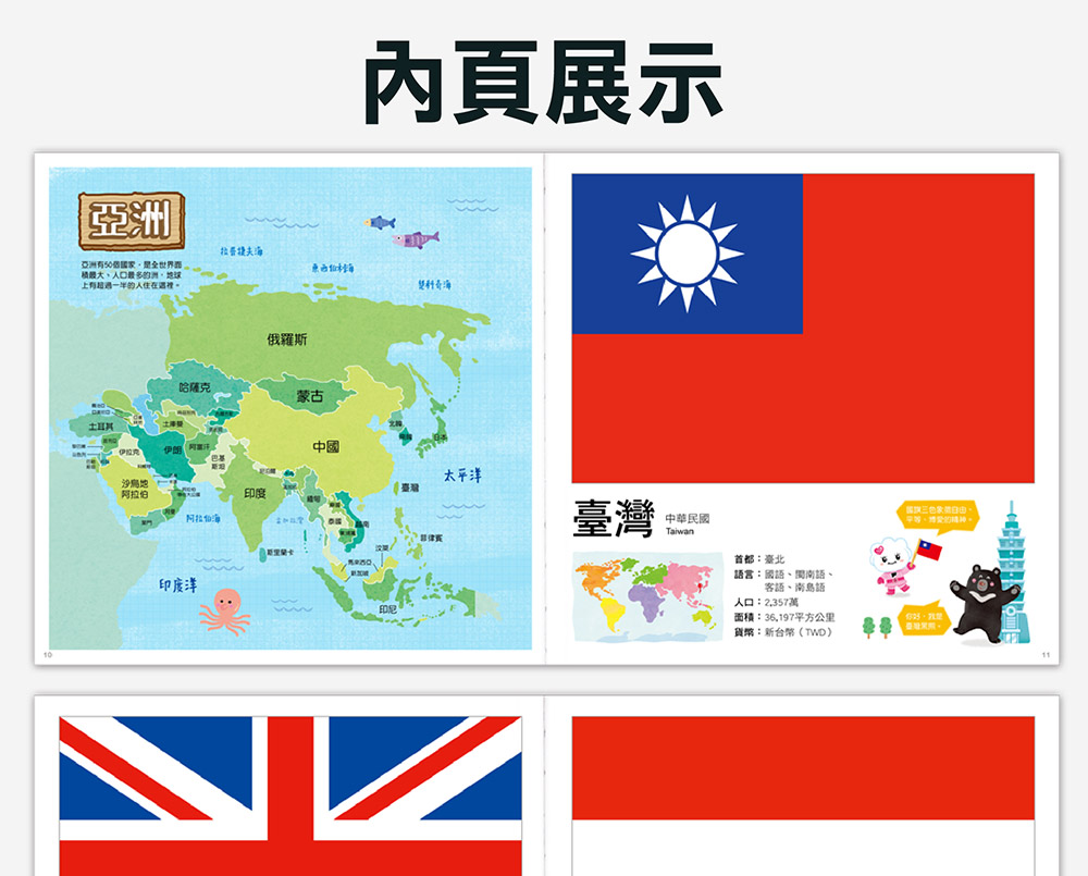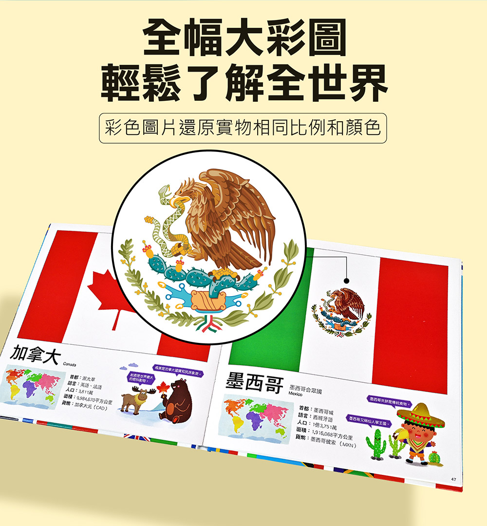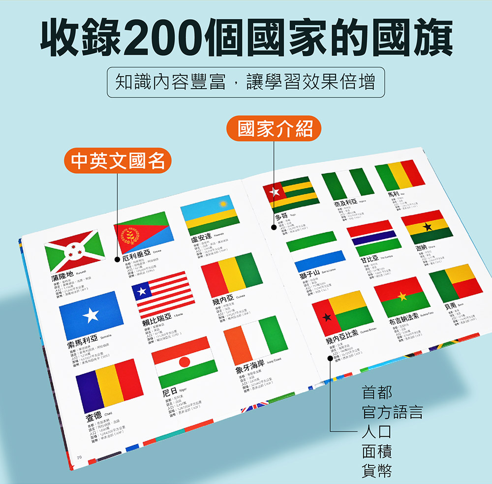介紹各國國旗、中英文國名、首都、官方語言、人口、面積、貨幣等基本資料,充實世界觀。