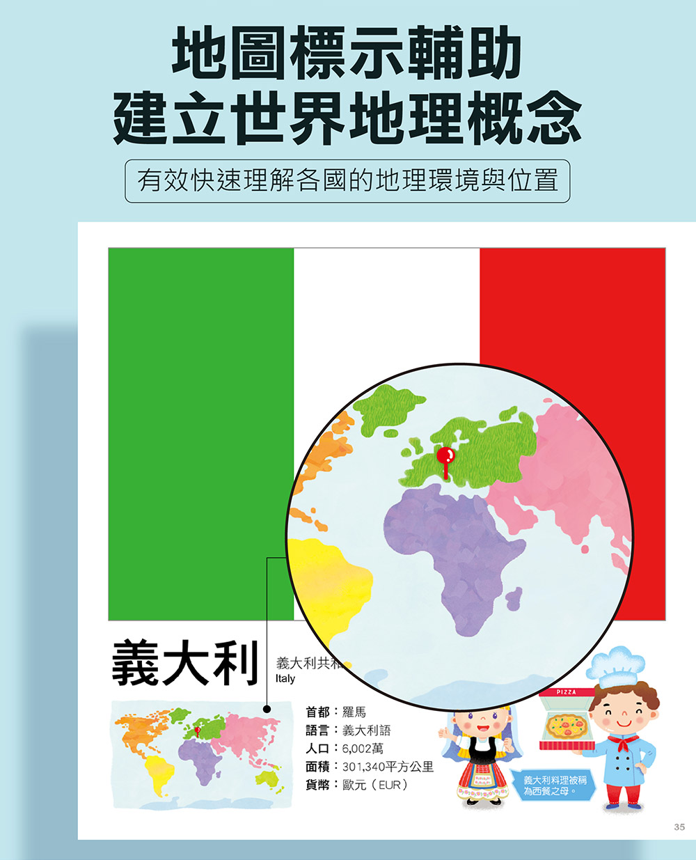以地圖標示輔助,有效快速理解各國的地理環境與位置,拓展孩子的視野。