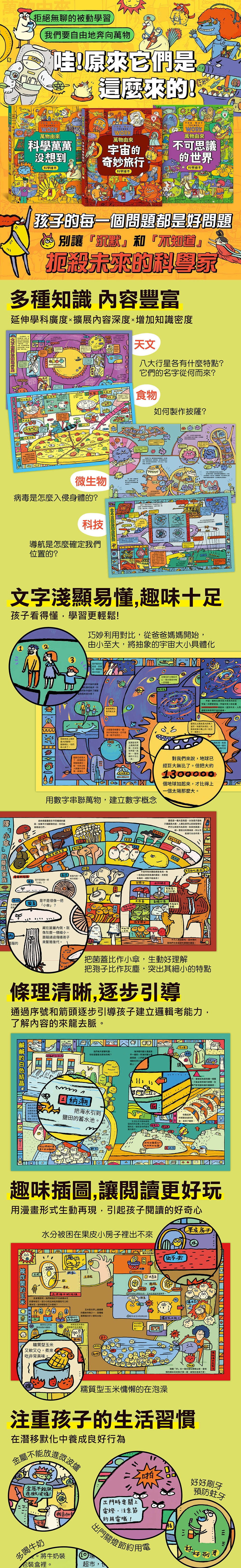 專為孩子設計的科普童書,說明拆解食物、機械、能源、天文、病理或科技的起源和應用,輕鬆理解科學性知識。