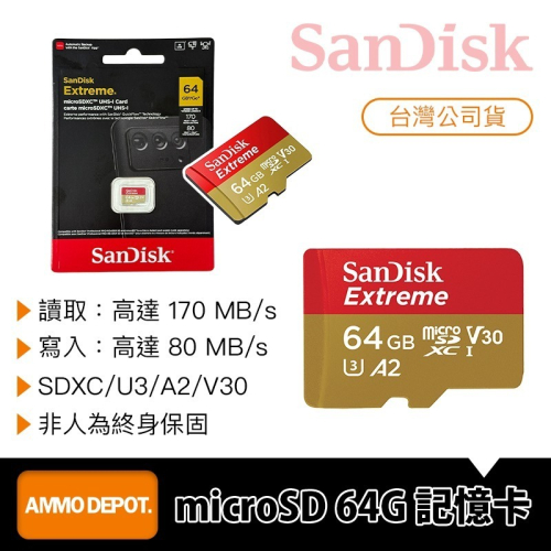 【彈藥庫】SanDisk Extreme microSD C10 U3 A2 V30 紅金卡 64G 記憶卡