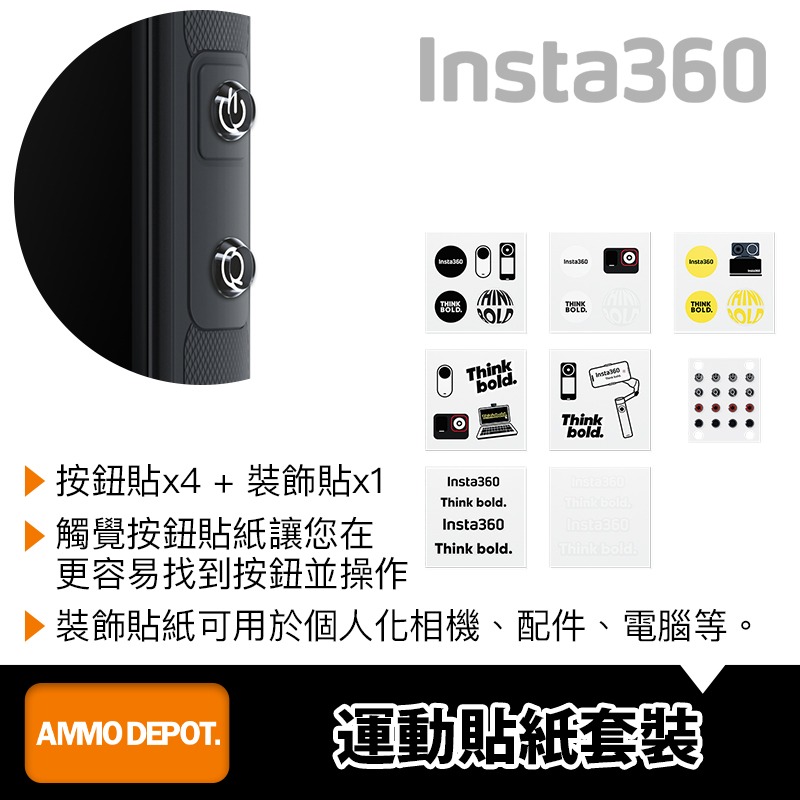 本賣場為 Insta360 運動貼紙套裝 賣場,不包含其他配件,拍照商品僅供參考。