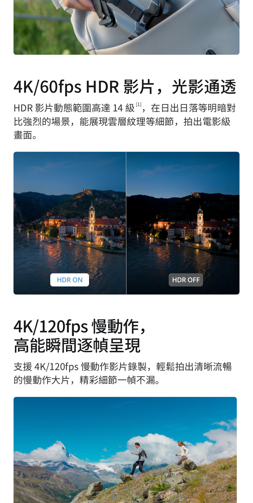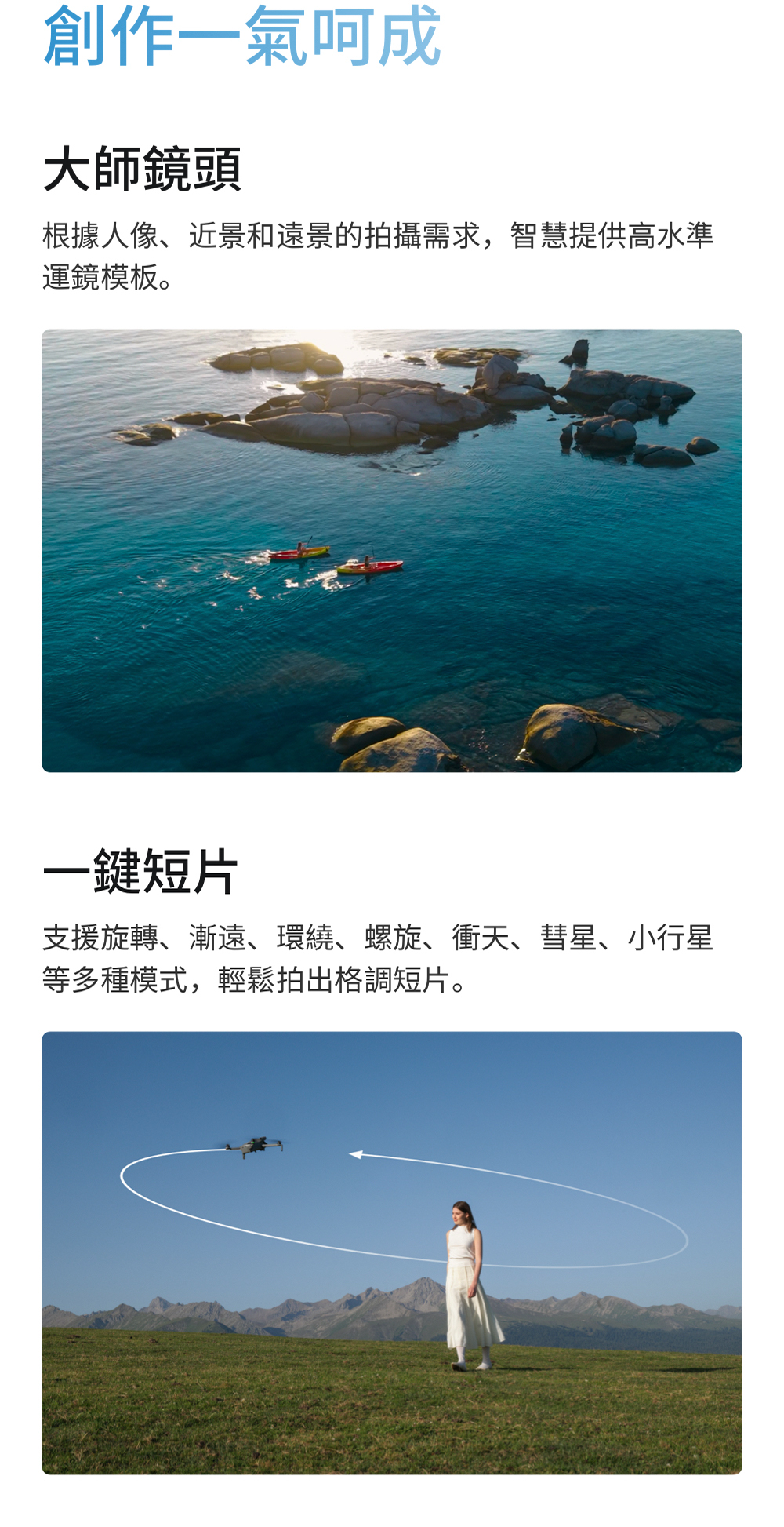 在海平面高度、微風環境下,飛行器以 100% 電量起飛,避障行為設定為煞停,相機設定為 4K/60fps 錄像模式。起飛後升至 120 公尺高度,以 15 公尺/秒速度向前飛行 1 公里後開始錄像(搭載智慧飛行電池錄像時長約 15 分鐘,搭載長續航智慧飛行電池錄像時長約 20 分鐘)。錄像開始後,飛行器以最高 10 公尺/秒速度調整機位及運鏡,總調整距離約 2 公里,其餘時間保持滯空停留,直至飛行器提示並執行自動返航,完成安全降落。數據僅供參考,實際飛行時請留意 app 提示。