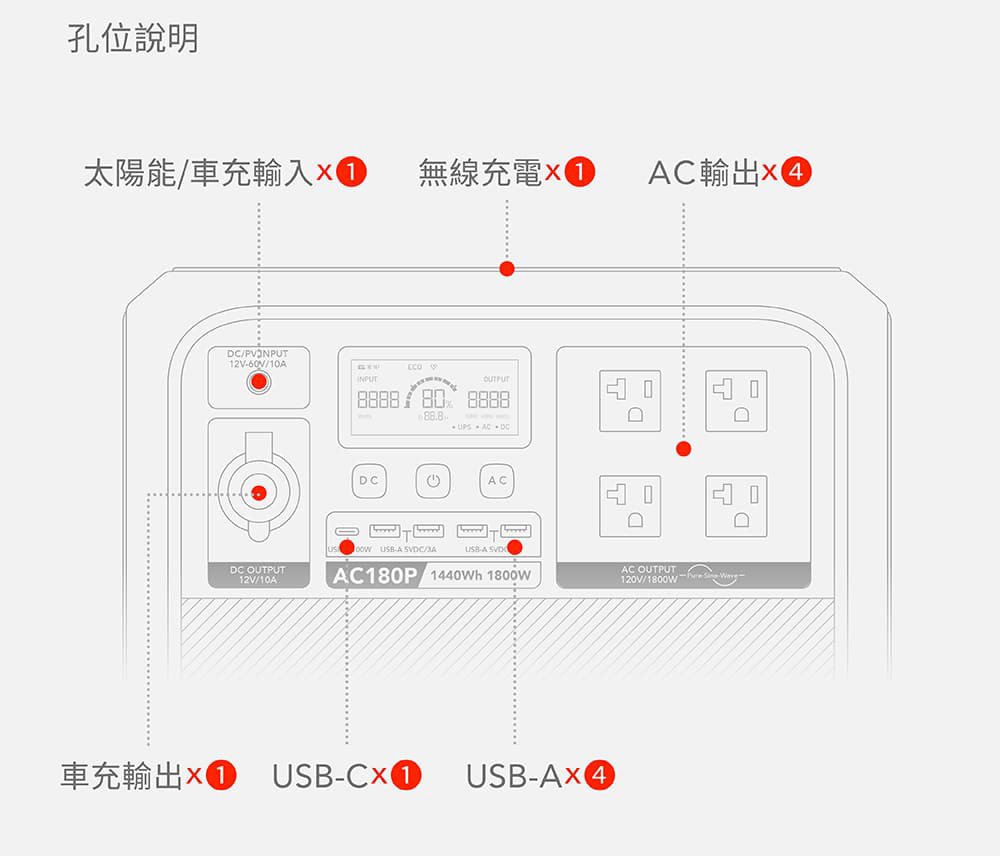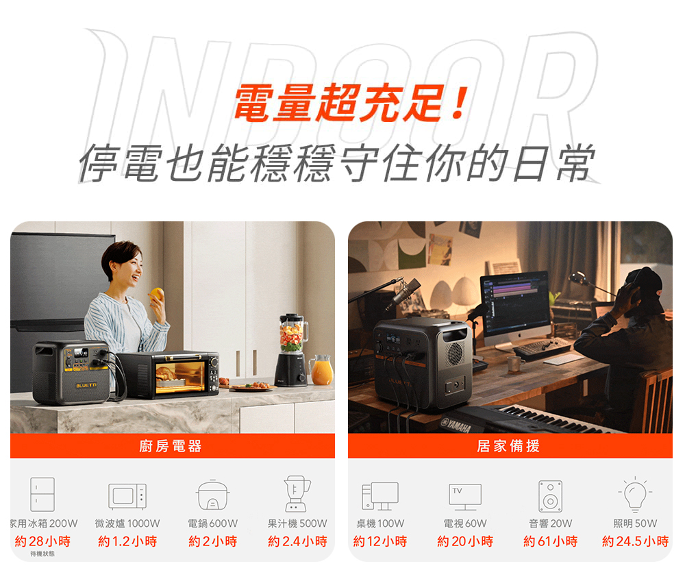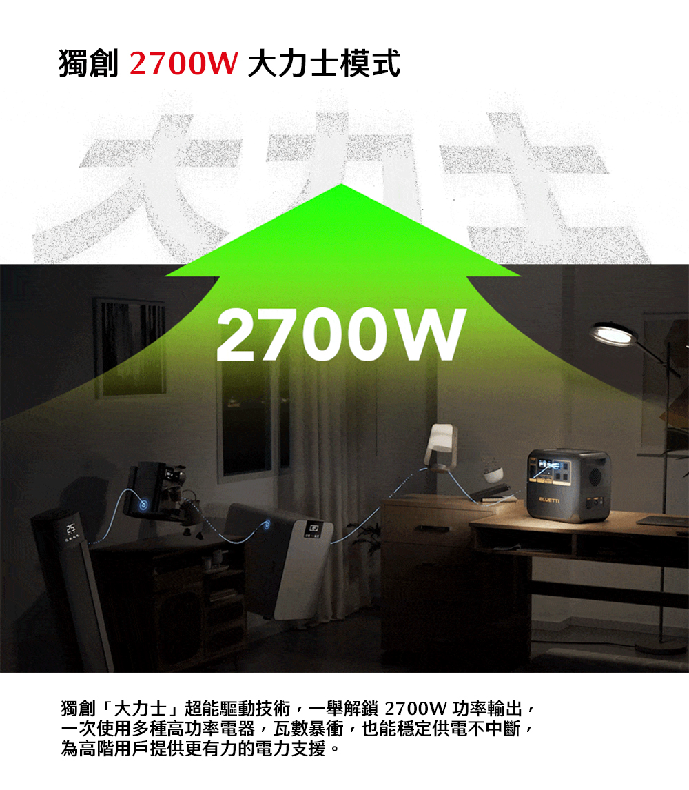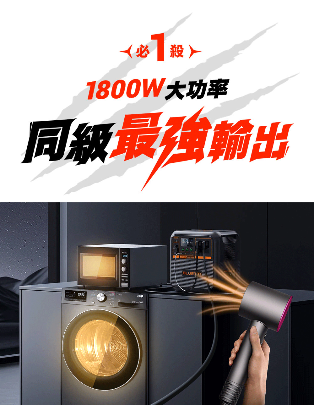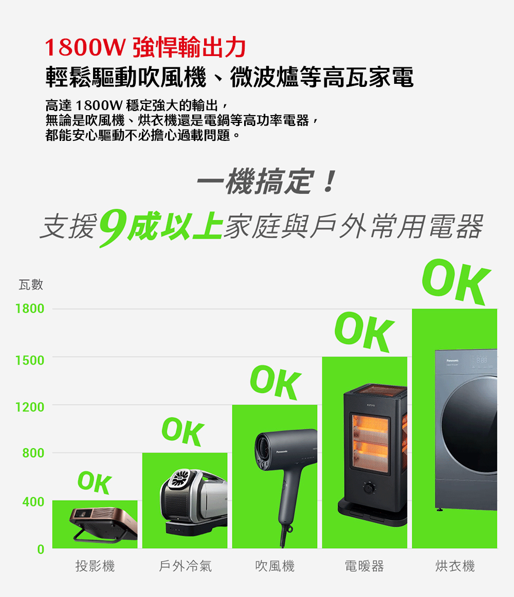 1800W同級最強輸出,支援吹風機、電磁爐。