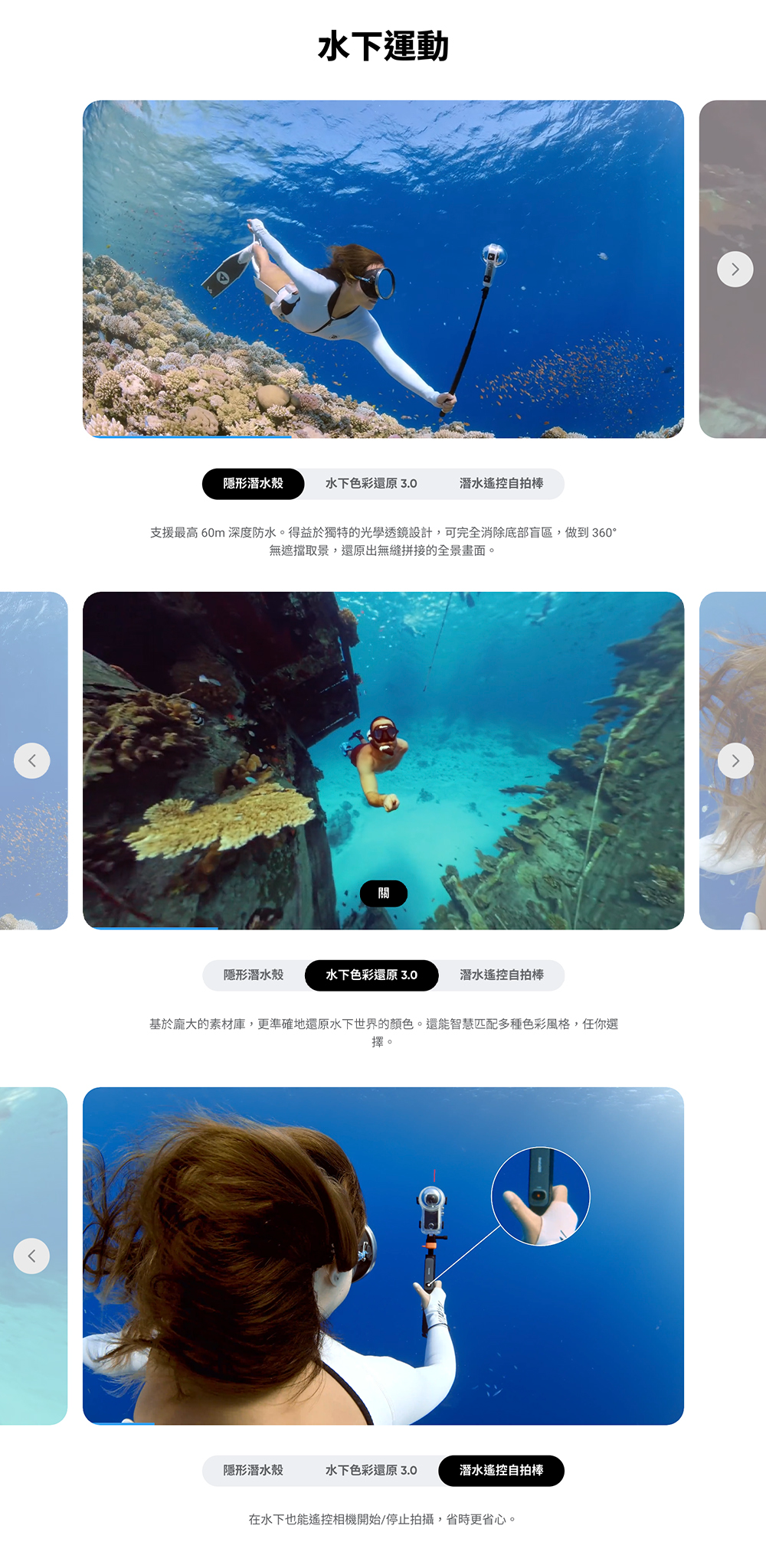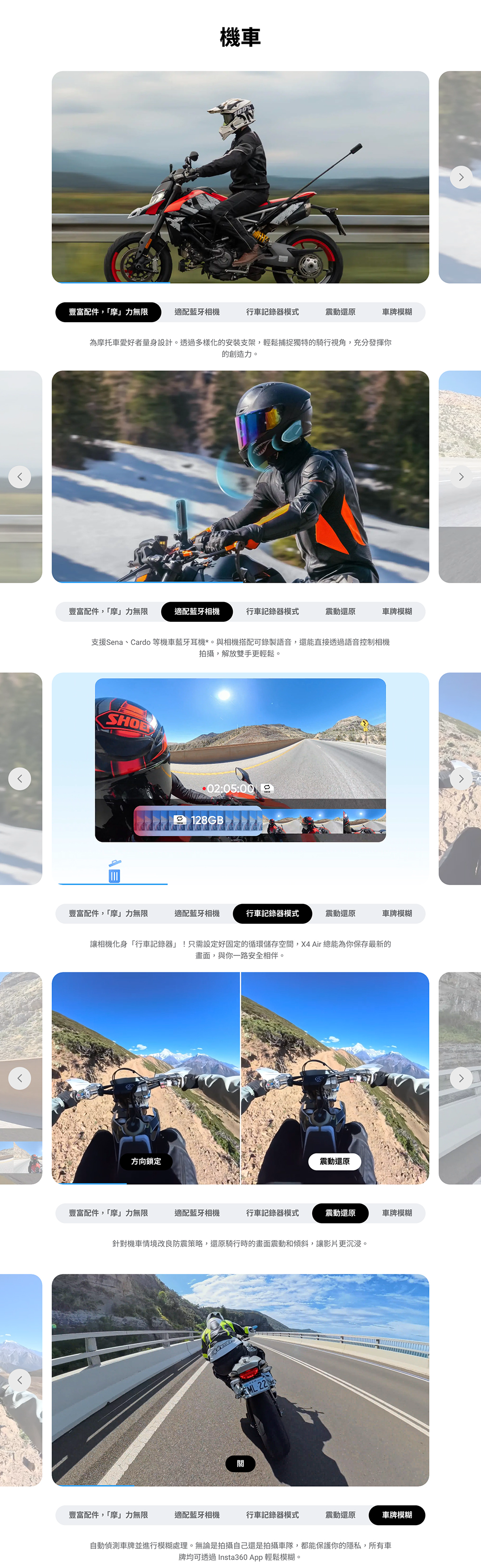 全景模式:標準錄影(支援運動 HDR)、InstaFrame模式、縮時錄影、移動縮時、循環錄影、行車記錄器模式