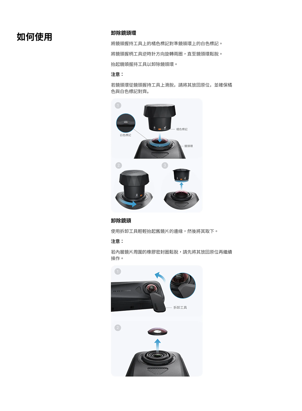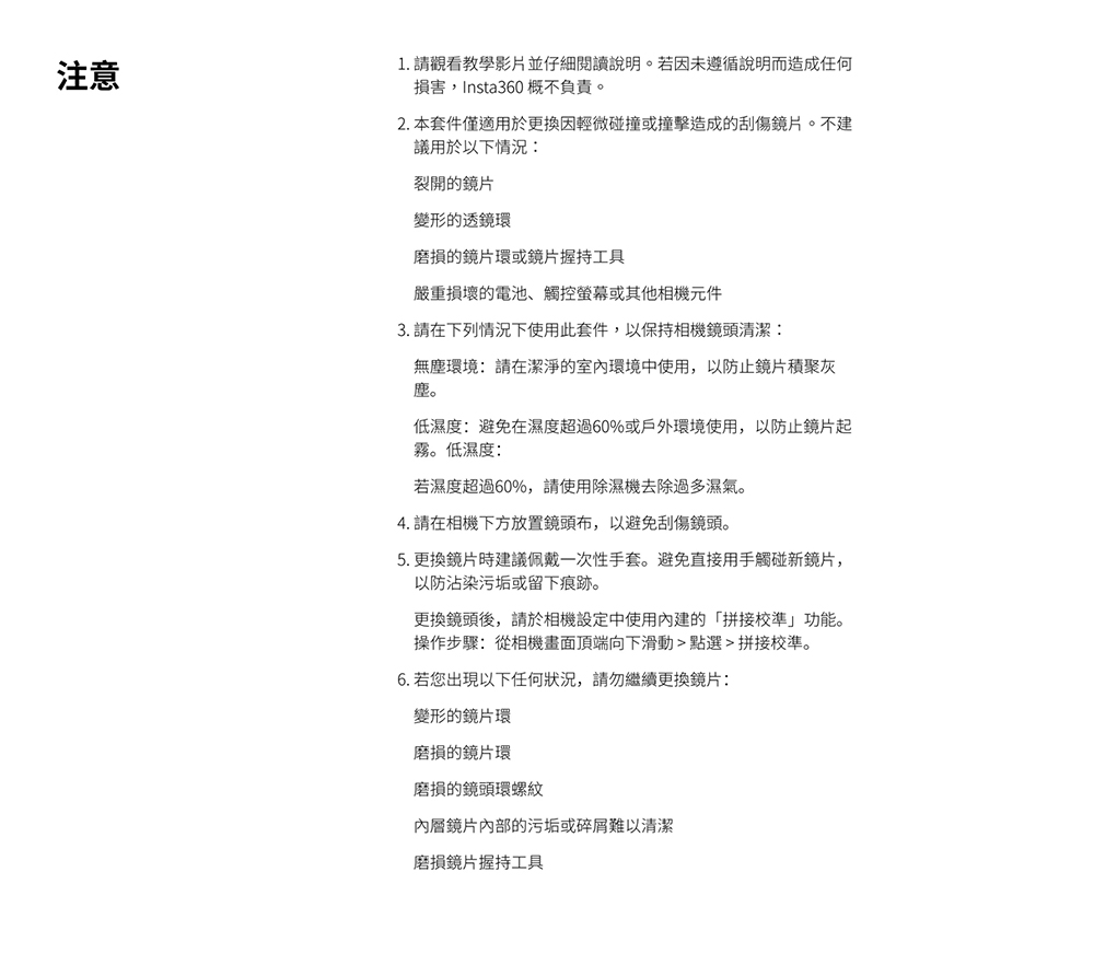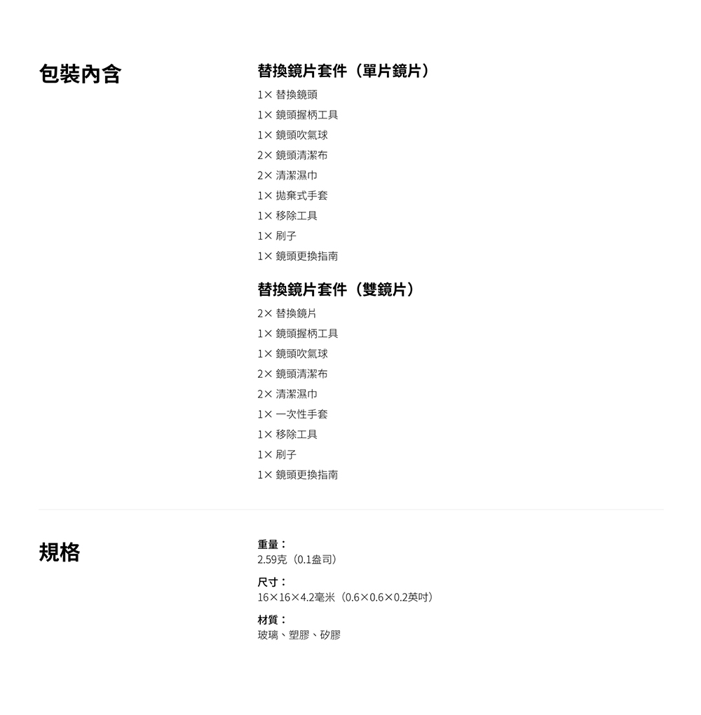 請在清潔、無塵且濕度低於60%的室內環境中使用此配件。如需更換鏡頭保護鏡的逐步指南,請參閱我們的教學影片。