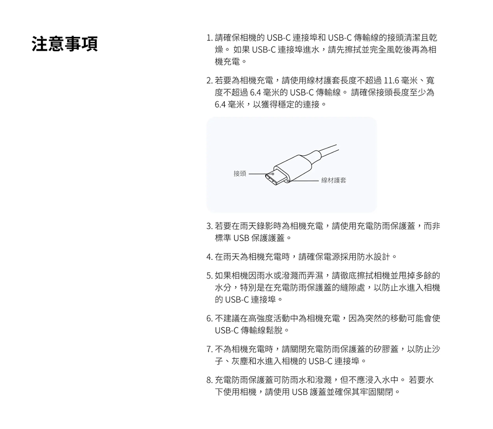 - IPX4 防護等級讓你能在潮濕環境下一邊拍攝一邊充電。