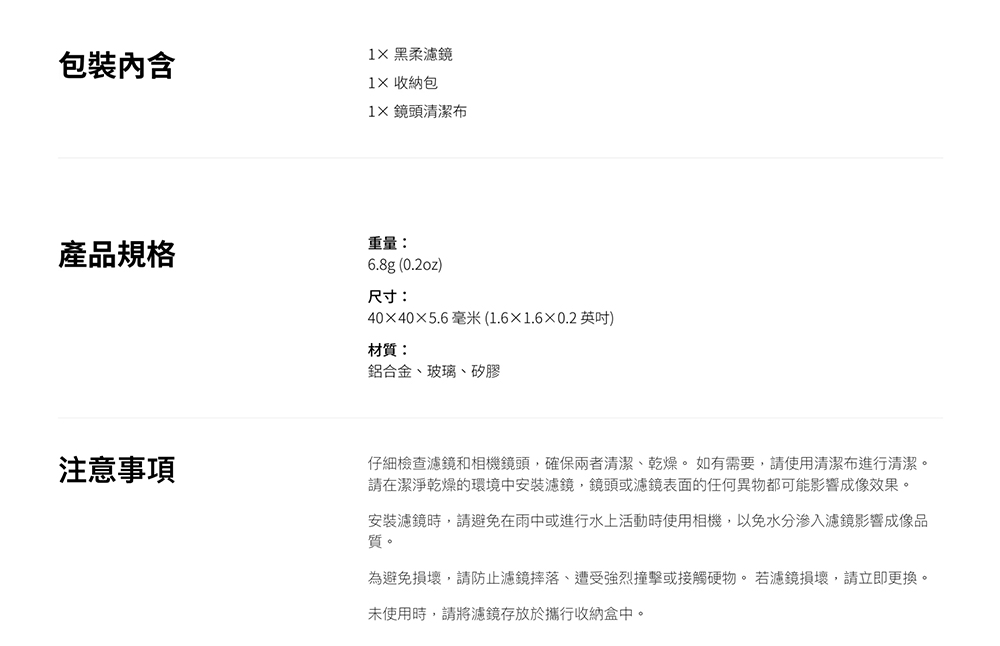 3. 為避免損壞,請防止濾鏡摔落、遭受強烈撞擊或接觸硬物。 若濾鏡損壞,請立即更換。