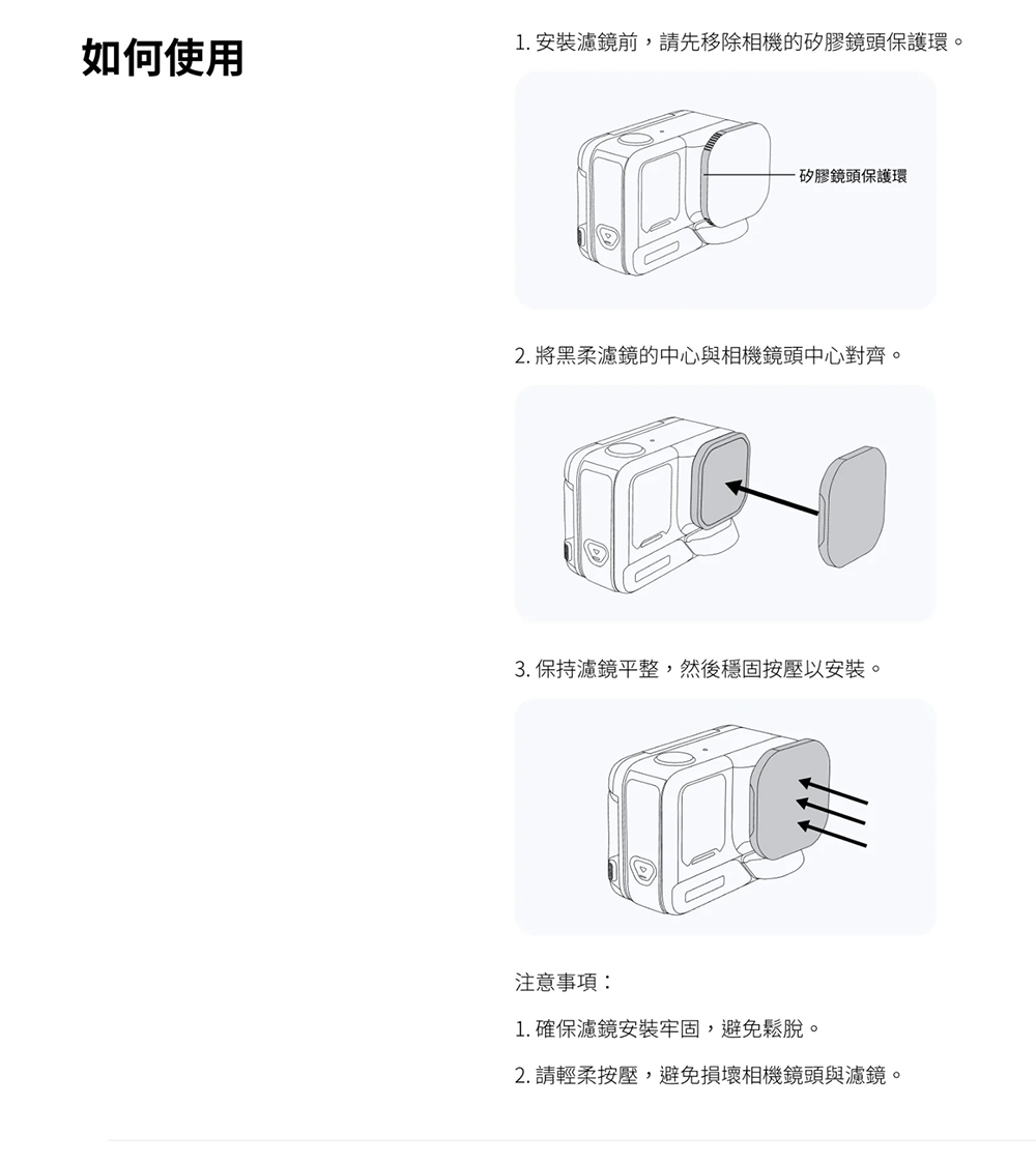 2. 安裝濾鏡時,請避免在雨中或進行水上活動時使用相機,以免水分滲入濾鏡影響成像品質。