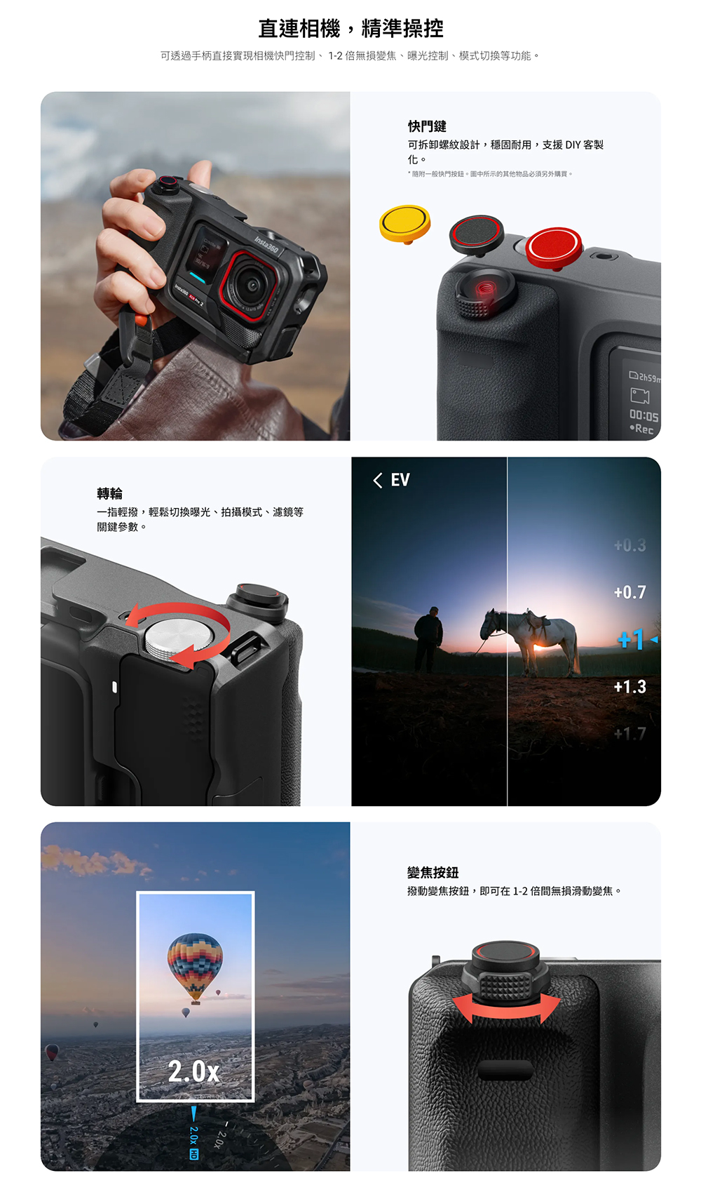 可直接與相機連接,透過手柄進行無損變焦、曝光控制、簡易模式切換等操作。