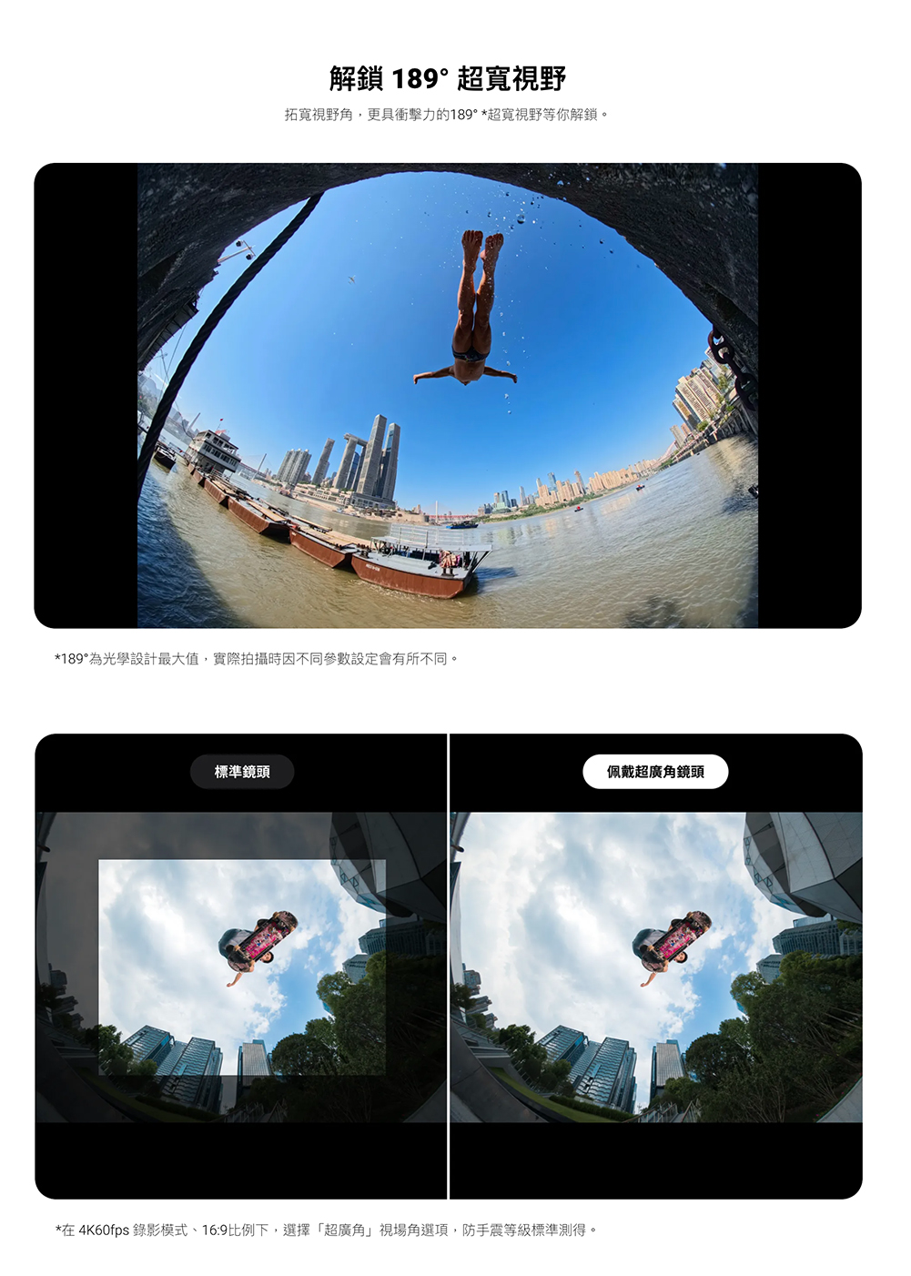 *以 4K60fps 影片模式、16:9 比例、UltraWide FOV 搭配標準防震動功能測量。