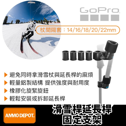 相容 GoPro 40 吋(1 公尺)碳纖維延長桿(另售)及 14mm~22mm 的滑雪杖。