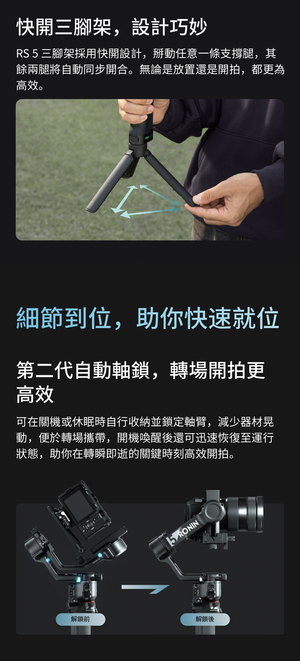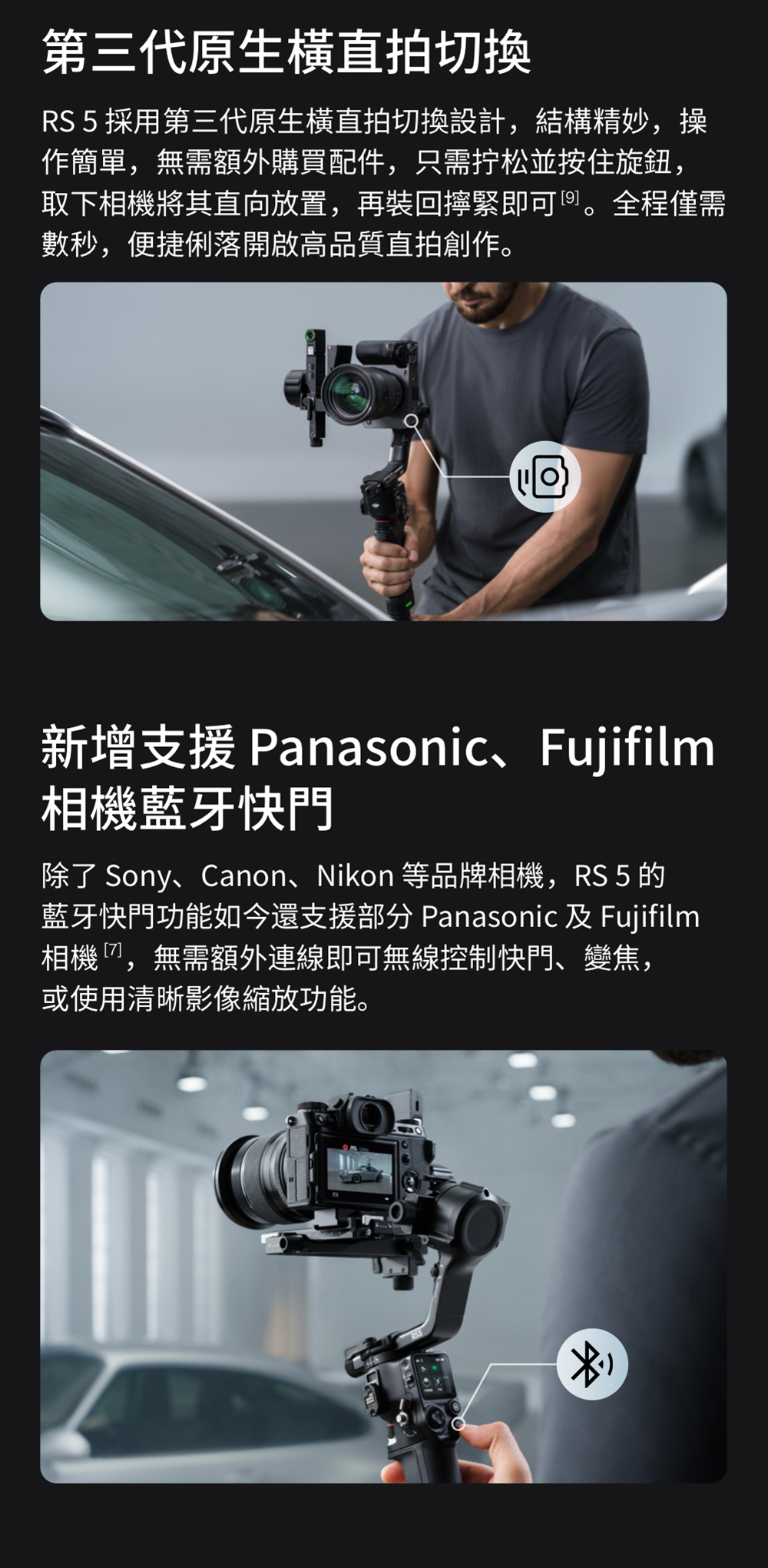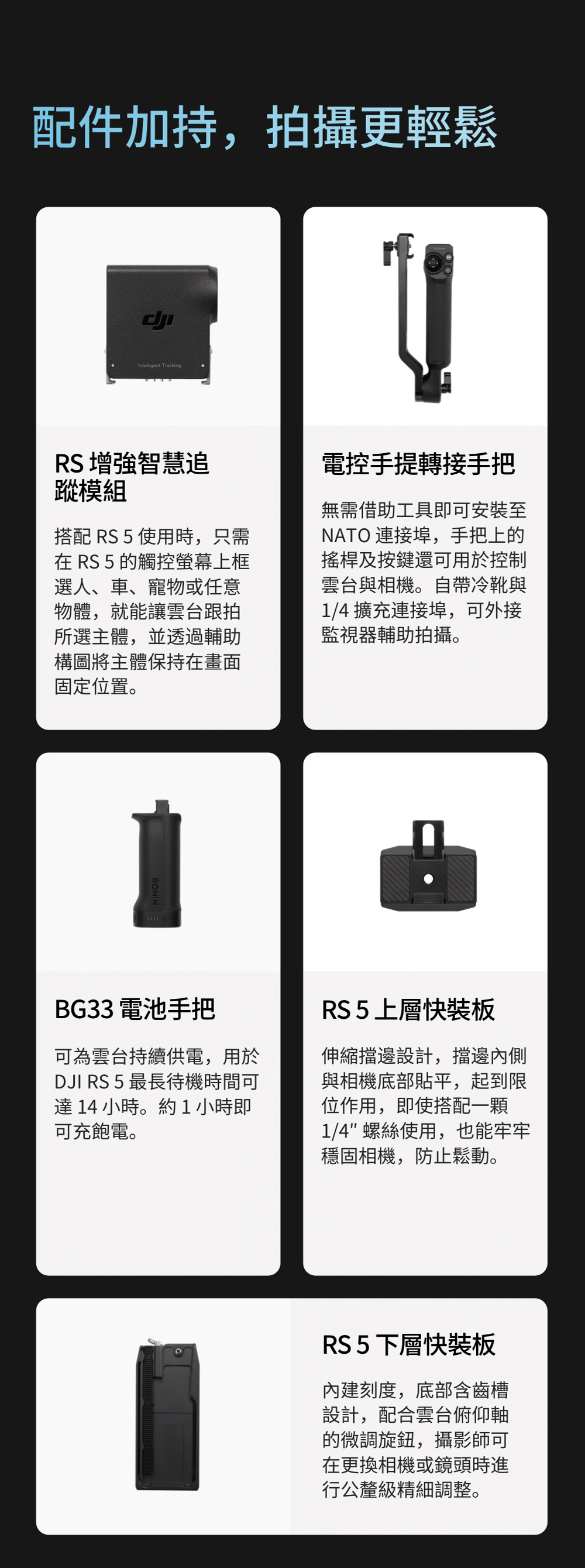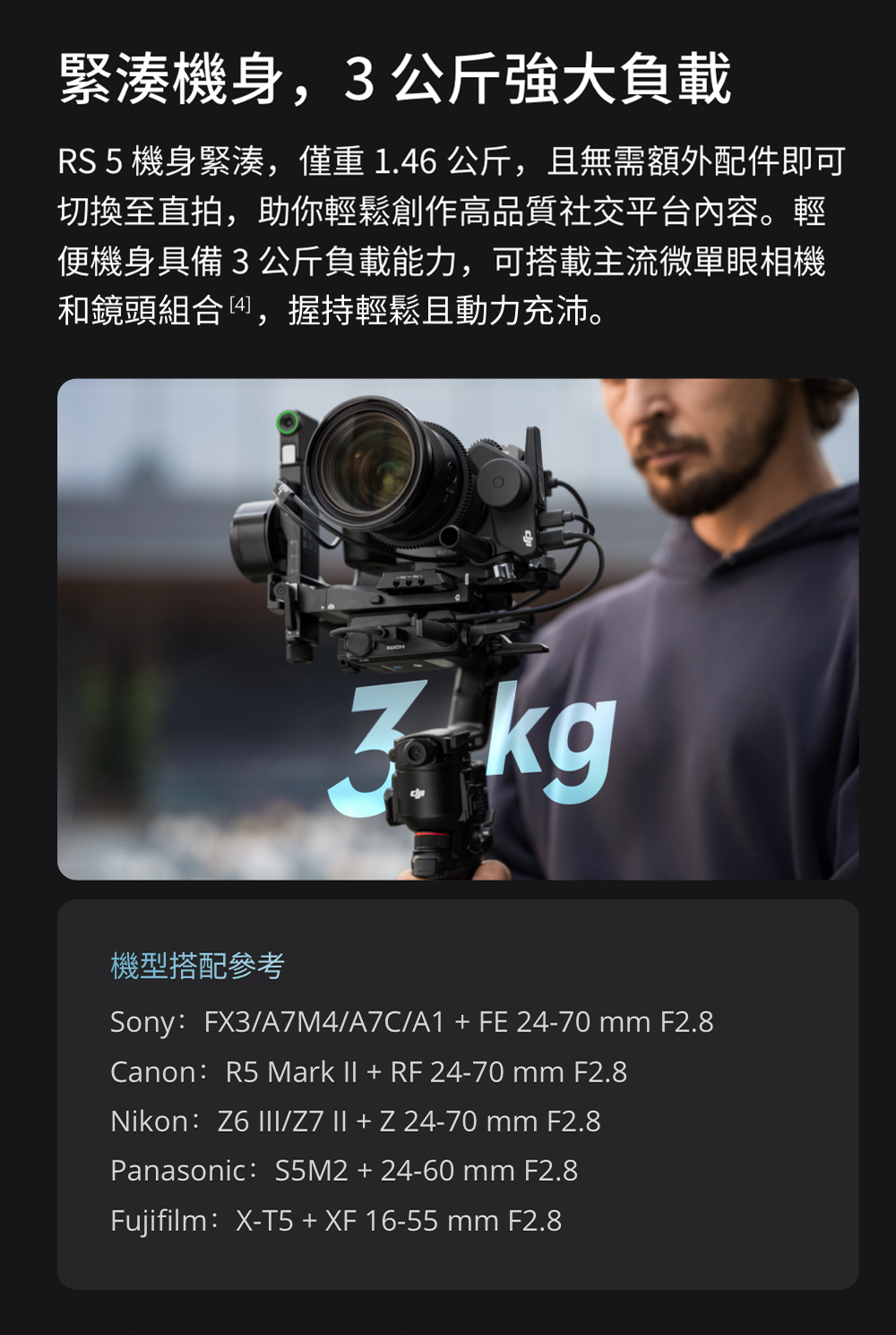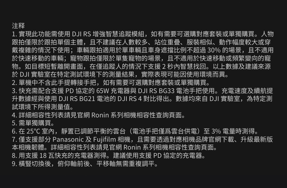 4.相容相機、鏡頭詳見官網《Ronin系列相機相容性查詢》頁面:https://www.dji.com/tw/support/compatibility。