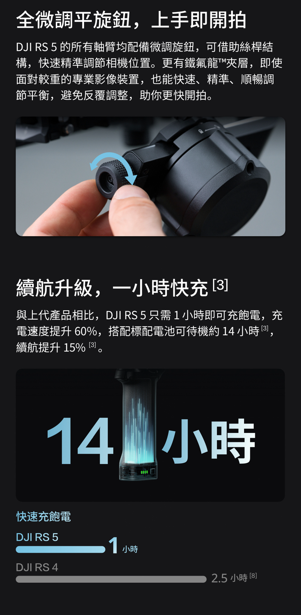 3. 快充需配合支援 PD 協定的 65W 充電器與 DJI RS BG33 電池手把使用。充電速度及續航提升數據經與使用 DJI RS BG21 電池的 DJI RS 4 對比得出。數據均來自 DJI 實驗室,為特定測試環境下所得測量值。