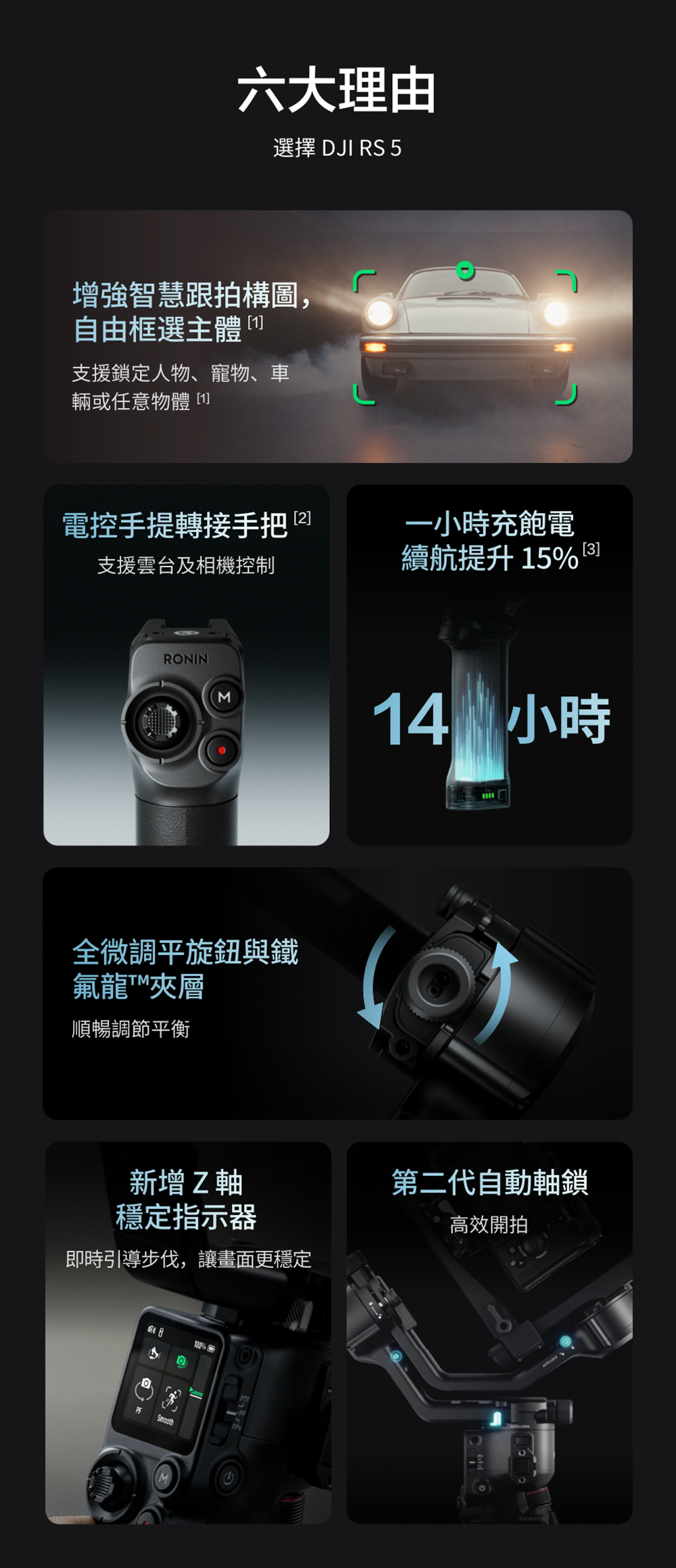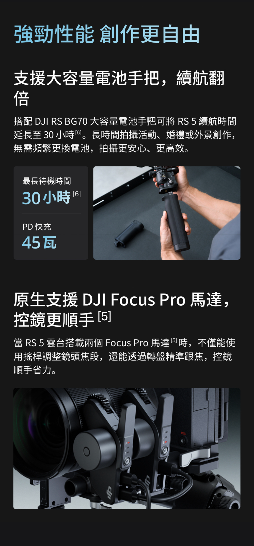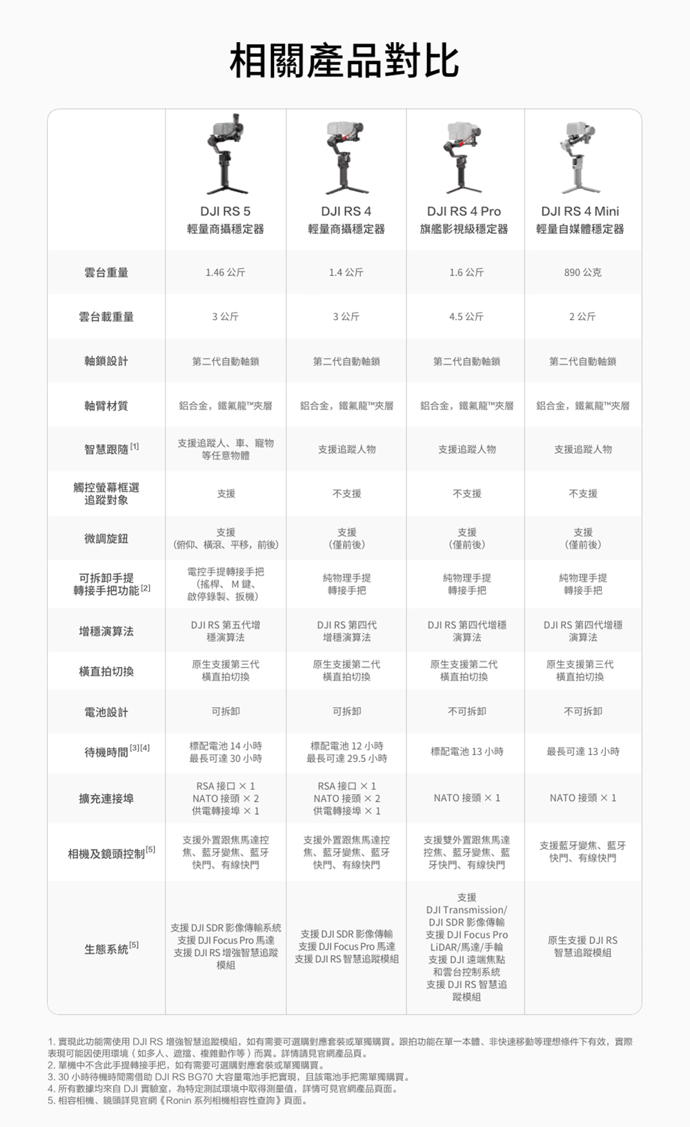 3.DJI RS 5、DJI RS 4 Pro、DJI RS 4 需借助 DJI RS BG70 大容量電池手把實現相對應的待機時長,且該電池手把須單獨購買。所有數據均來自DJI實驗室,為特定制式環境中取得測量值,詳情可見官網產品頁面。