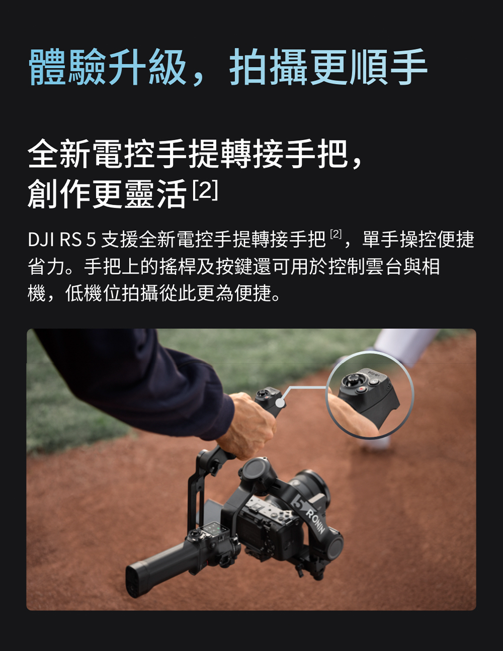 電控手提轉接手把[2],支援雲台及相機控制。