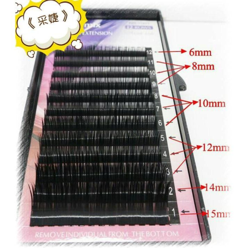 【韓國黑鑽毛0.15C mix款】 粗度:0.15 捲度:C 材質:蠶絲蛋白(12排裝) 尺寸:6m*1/8m*3/10m*3/12m*3/14m*1/15m*1mm綜合款! 目前最夯的黑鑽毛,比一般睫毛更黑更亮,接完後無需再補眼線,眼睛大又有神!毛質好,不易過敏~~~ (下睫毛到眼尾,通通一盒搞定)