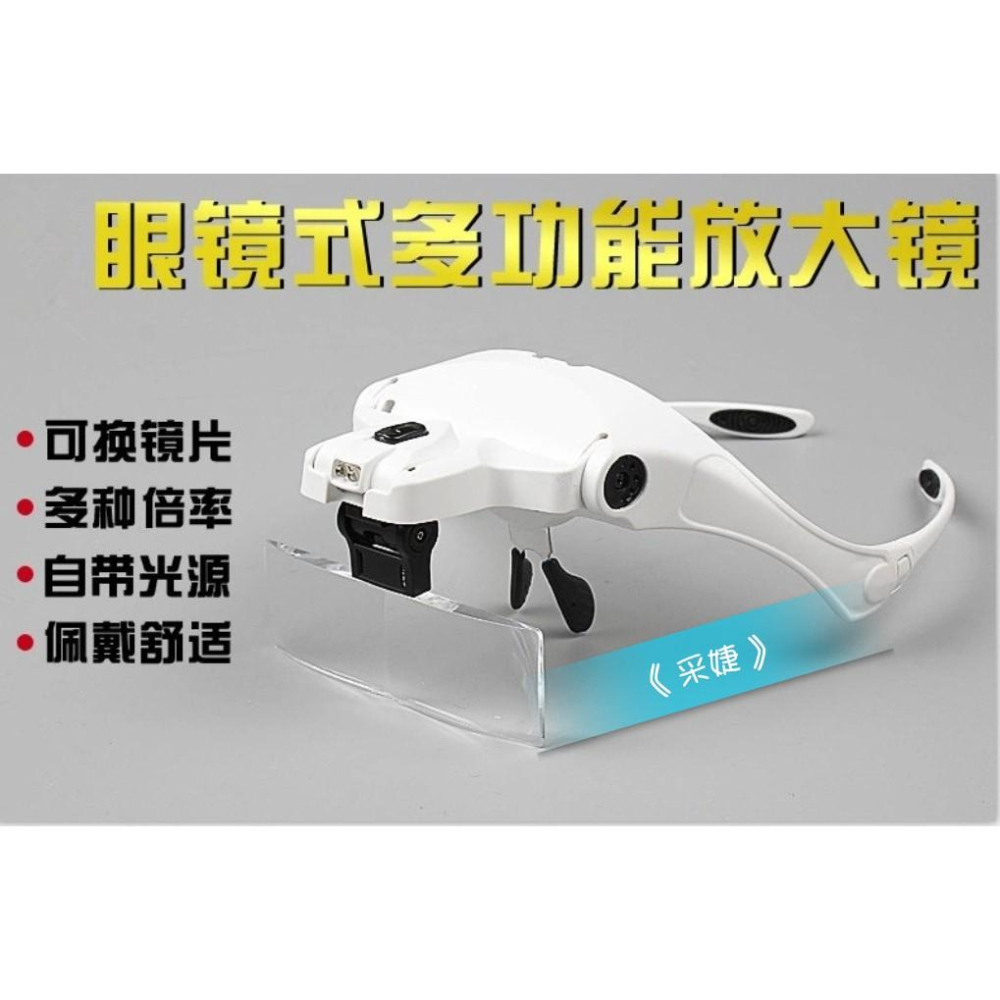【眼鏡式/頭戴式二用 LED放大鏡組(白色款)】 內容:五段鏡片倍數~ 1X = 焦距 250 ~ 350mm 1.5x= 焦距 200 ~ 300mm 2.0x= 焦距 175 ~ 275mm 2.5x= 焦距 150 ~ 250mm 3.5x = 焦距 80 ~ 120mm ==>附中文說明書,請自備四號電池三顆! ps:此款最適合無近視或戴隱形眼鏡的人使用!!如果本身有戴一般眼鏡,這款會影響鏡架,建議買另一款【雙鏡片放大鏡(無鏡架款)】。((有近視的人,一樣要戴眼鏡再戴放大鏡,不是戴放大鏡就不用戴近視眼鏡,鏡片不同,功能不同唷!)) 說明:鏡架可換綁帶式,五段鏡片看個人需求使用,不易滑落!附二顆LED燈,可調整照明方向,增加照明度;鏡片角度也可前後微調距離,額頭有止滑設計,固定性佳。【減少接睫/美甲/美容清粉刺~時眼睛的負擔】,避免提早老花或近視唷!
