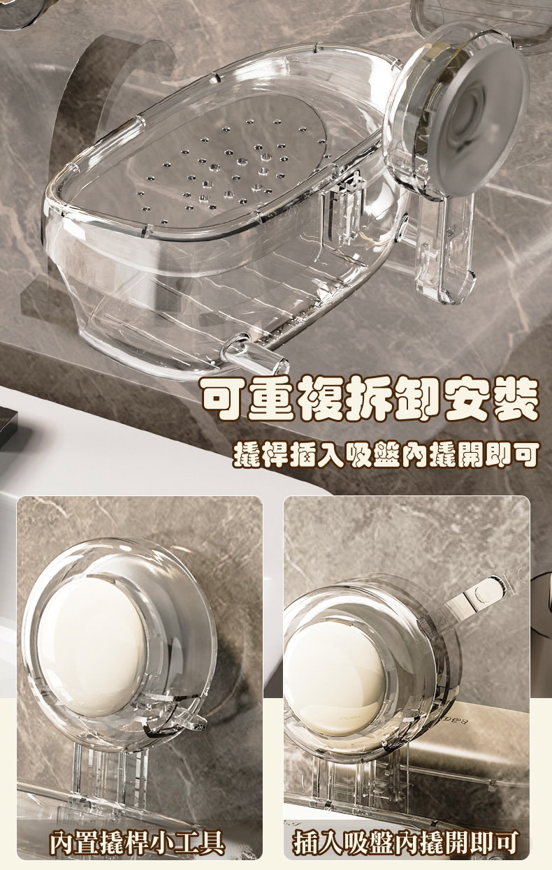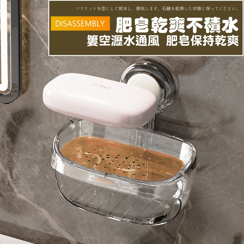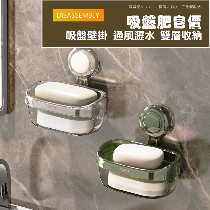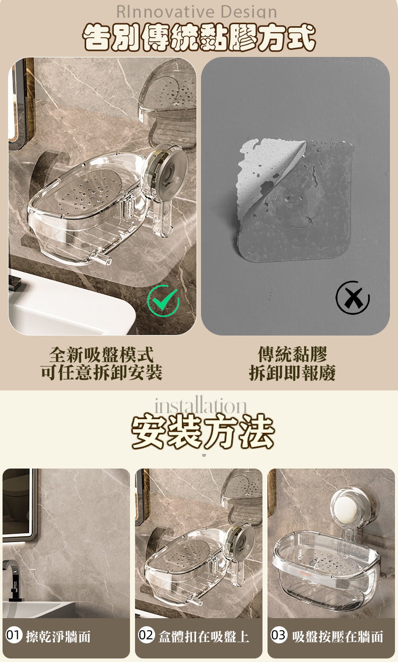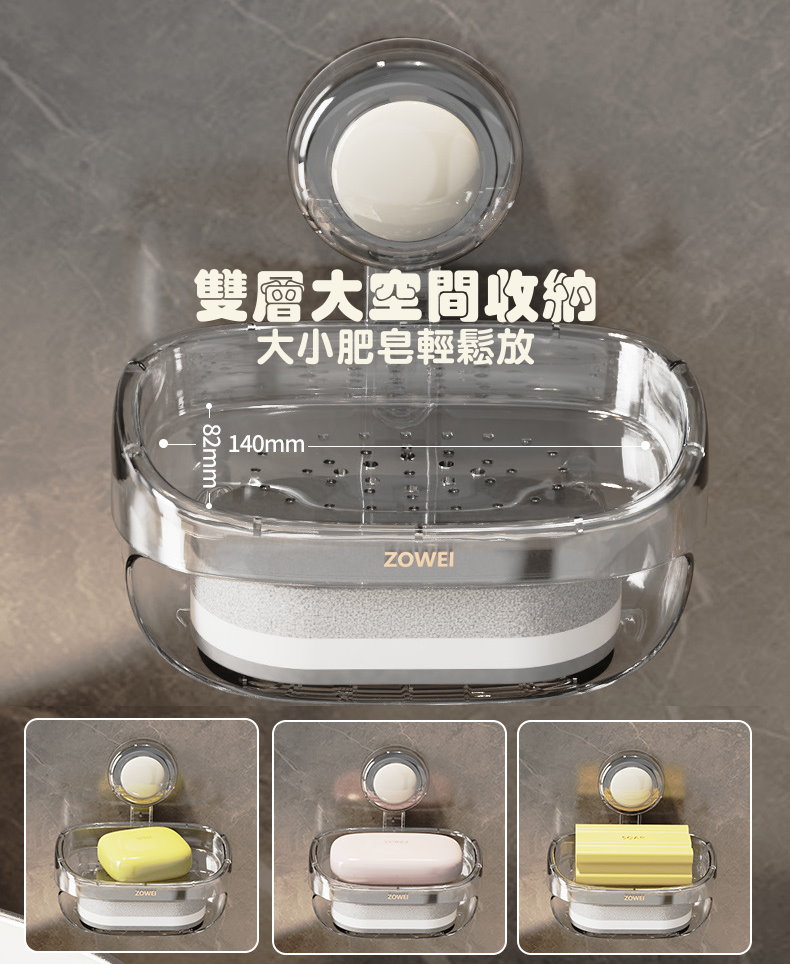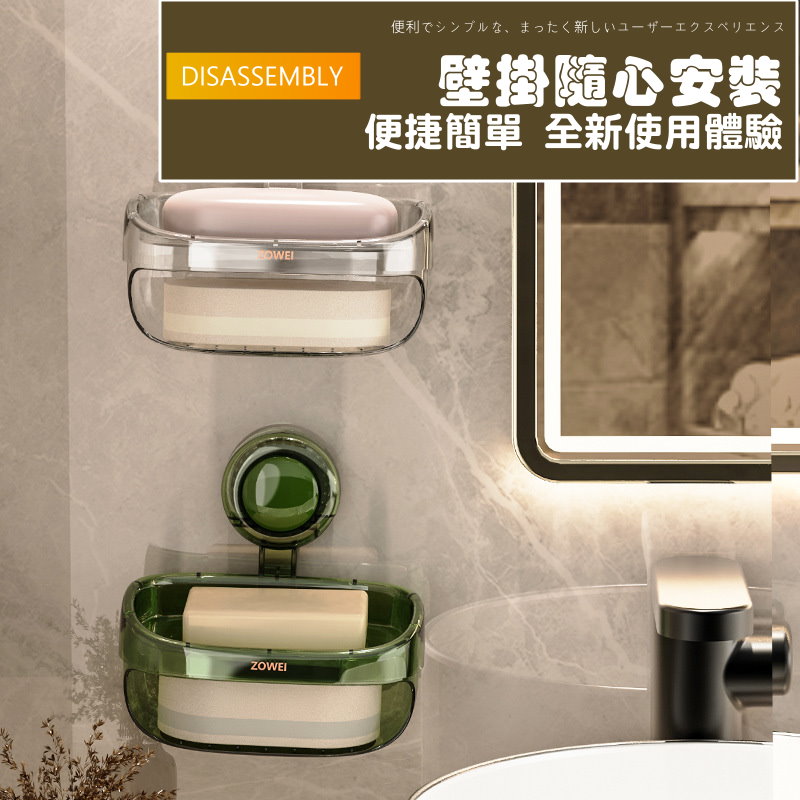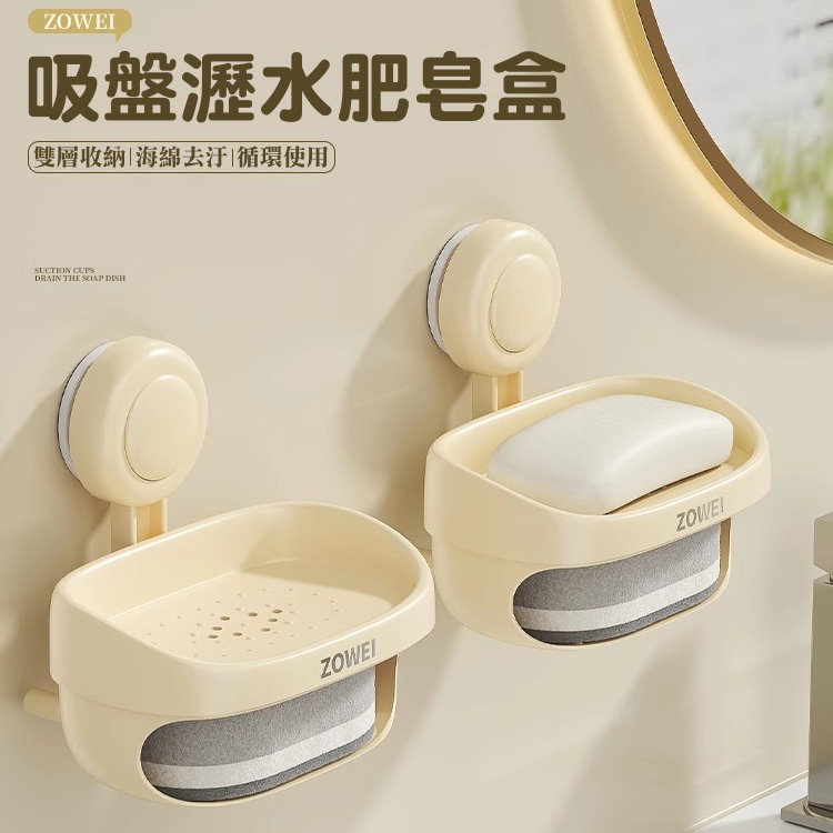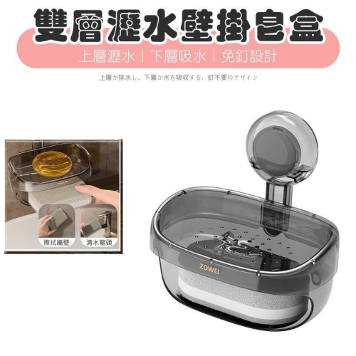 📦 包裝內容:雙層吸水皂盒 x1、無痕壁貼 x1、雙面海綿 x1