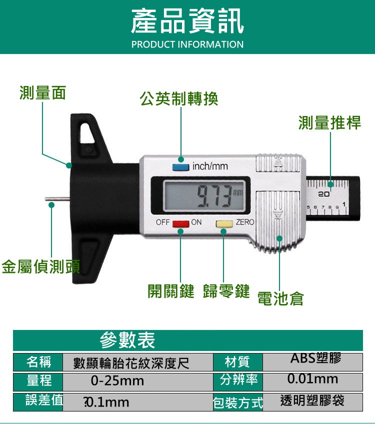 項目內容說明產品名稱數位電子胎紋深度尺顯示方式LCD液晶螢幕測量範圍0 ~ 25.4mm精度0.01mm單位切換mm / inch材質ABS工程塑料電池LR44鈕扣電池顏色黑 / 藍 / 銀 三色可選重量約50g