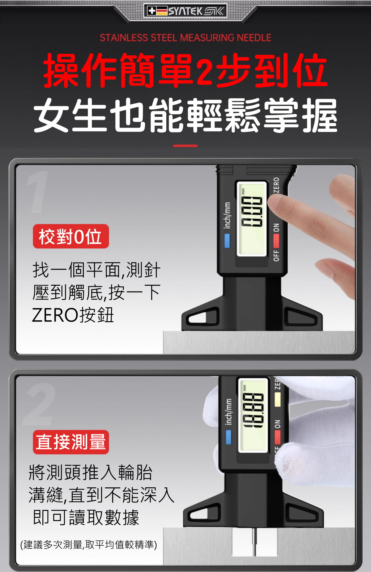 ⚠️ 使用前請確認測針歸零 🔋 若顯示不清請更換電池 💧 勿在潮濕環境長時間放置
