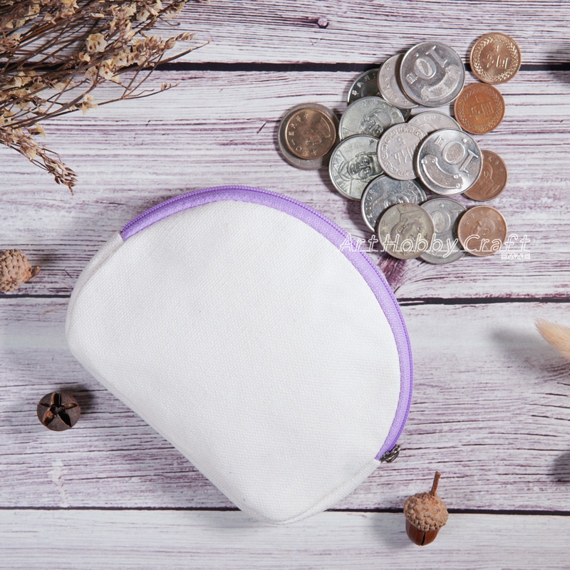 這款 半圓形帆布零錢包 採用10盎司漂白帆布製成,袋身簡約可愛,搭配多色包邊設計,適合手作拼貼、彩繪創作,亦可作為日常收納包使用,輕巧實用,風格百搭!