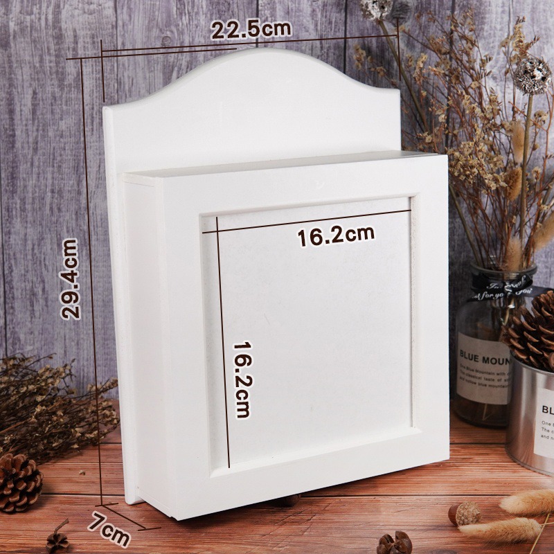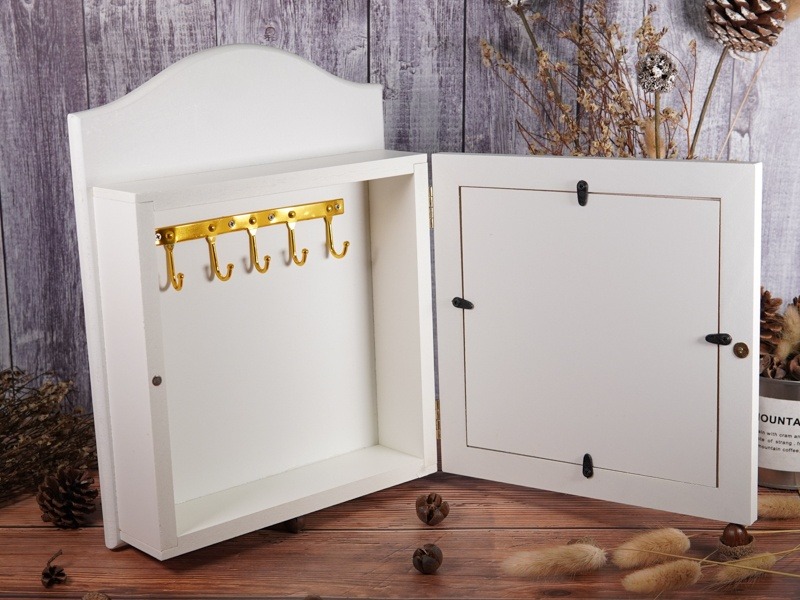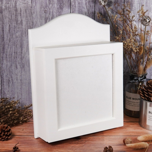 這款白色木器鑰匙盒,結合相框外型與實用功能,正面可放入約 16×16cm 照片,