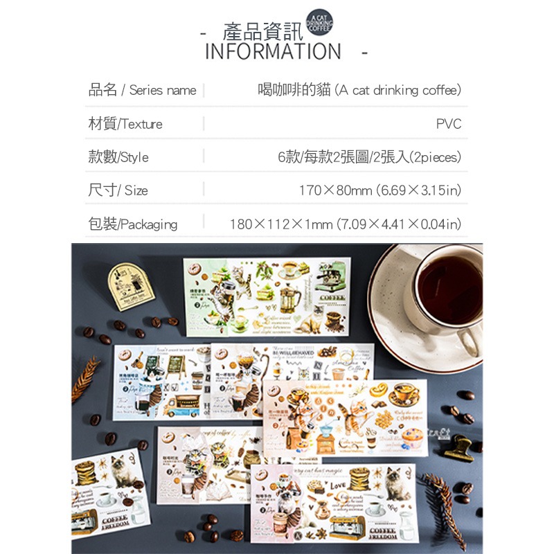 台灣現貨 小麥手作舖︱喝咖啡的貓咪-PVC轉印貼紙︱貓咪 咖啡 主題 手帳 素材貼紙 咖啡主題 咖啡控拼貼 可愛風格轉印