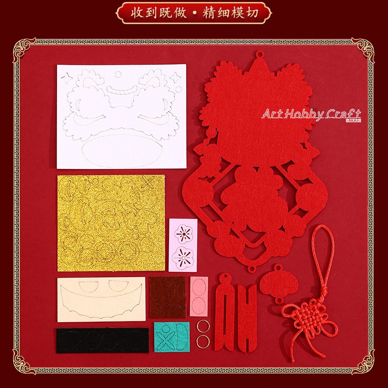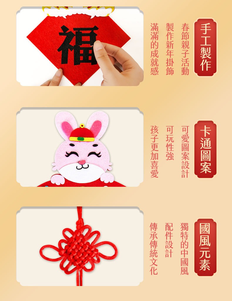 內含材料: 不織布底片、圖案貼片、中國結掛繩、掛圈