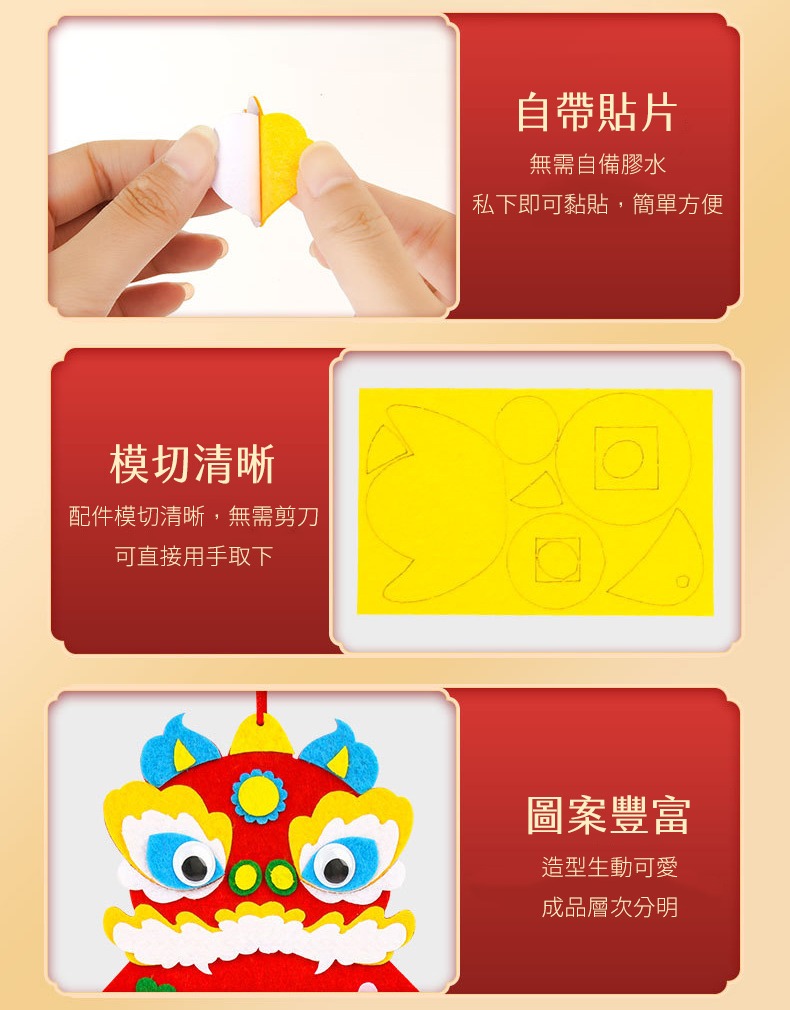 配件齊全,容易分辨,製作簡單完成後滿滿的成就感,讓孩子在玩耍中體驗傳統文化。