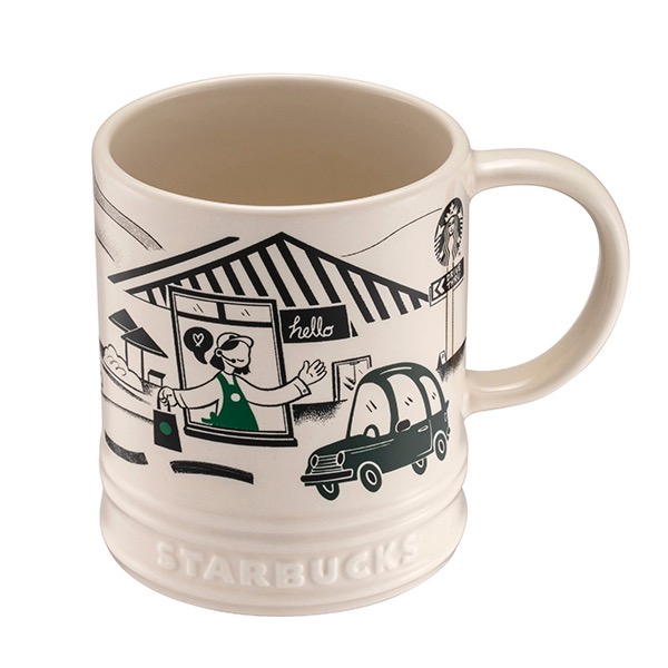 馬克杯簡單素雅的色彩搭配輕鬆趣味生動插畫,完整呈現Drive-Thru車道服務中夥伴與顧客的互動場景。杯身細緻的品牌字母浮雕工藝,結合實用杯型,為您的星巴克生活增添一股美好便利的車道咖啡時光。