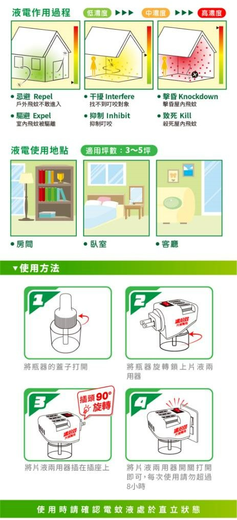 1.適用3-5坪的房間,每日使用不可超過8小時。使用時暫時關閉門窗,人、寵物離開,可提高防治效果。若人、寵物停留在室內,使用時應打開門窗保持空氣流通。