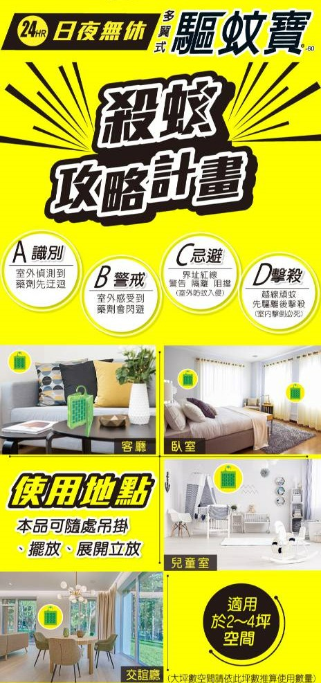1.直接將本品吊掛或放置於蚊子易出沒之處,例如:陽臺、玄關、紗窗門內、外出入口處。