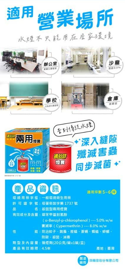 防 治 對 象 :防治蚊子、跳蚤、塵蟎、蒼蠅、螞蟻、蟑螂、防黴、殺菌、消毒