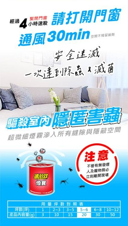7.經過2~4小時後重返施藥場所,應先打開門窗使空氣流通,至少等待30分鐘後再進入室內活動,開啟煙霧偵測劑或保鮮膜取下。