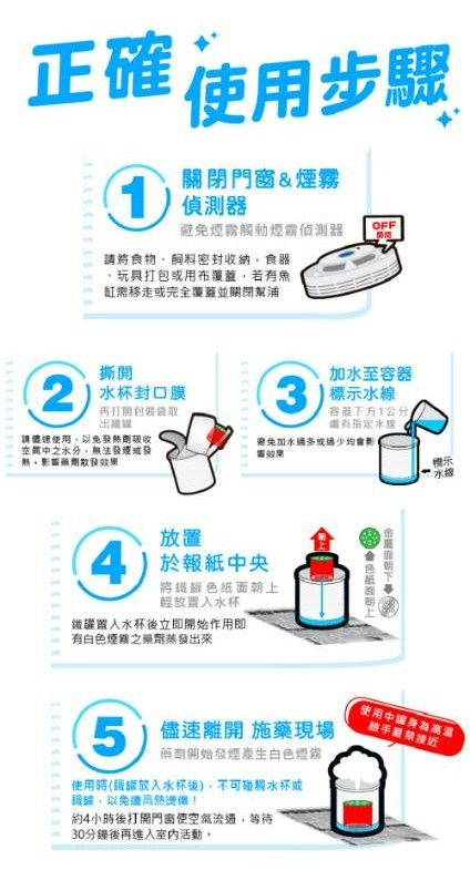 4.藥劑蒸出前(鐵罐放入水杯後之30秒),不可碰觸水杯或鐵罐,且人、畜及寵物必須儘速離開(或移開)施藥現場,以免遭高熱燙傷或誤吸入藥劑引起身體不適。