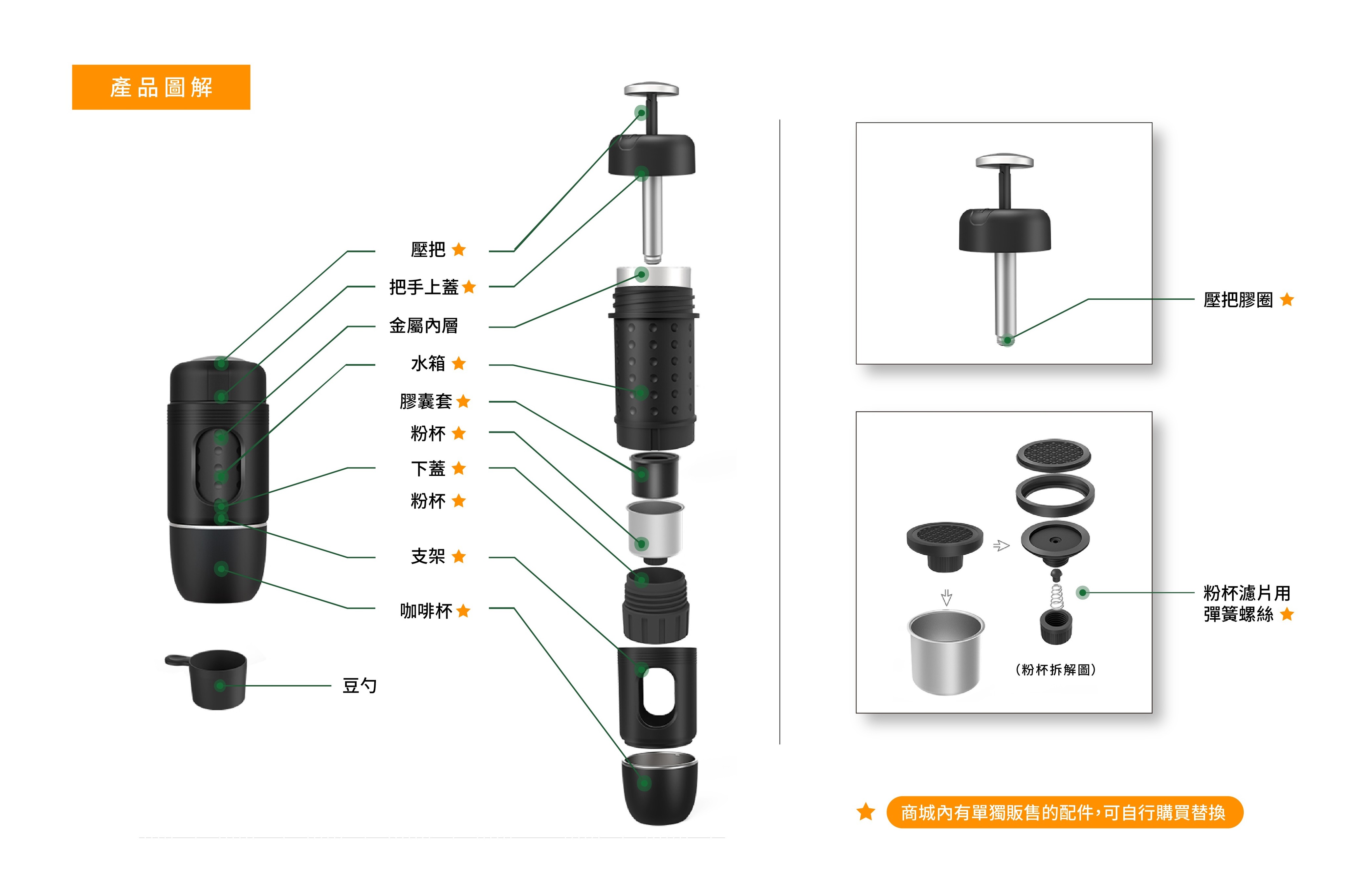 配件:便攜外出包、擦拭巾、豆勺、毛刷