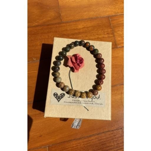 約6mm天然紅松石,手圍約15.7。 松石類統稱綠松石,此手鍊中無綠色松石,他是美國紅松石。 雖然老闆有挑過,但綠松石本就易有礦缺、平頭,介意者勿下標。