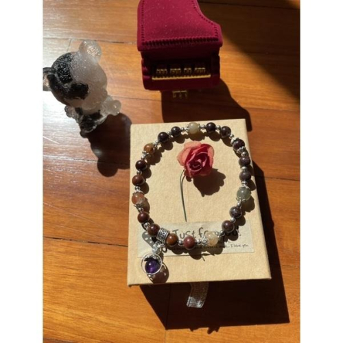 約7mm天然烏拉圭紫水晶+約6mm滿幽靈+約6~7mm四季幽靈的設計款手鍊,有些有帶到盆料,皆為透料,手圍約17.5,銀飾為純銅及藏銀。