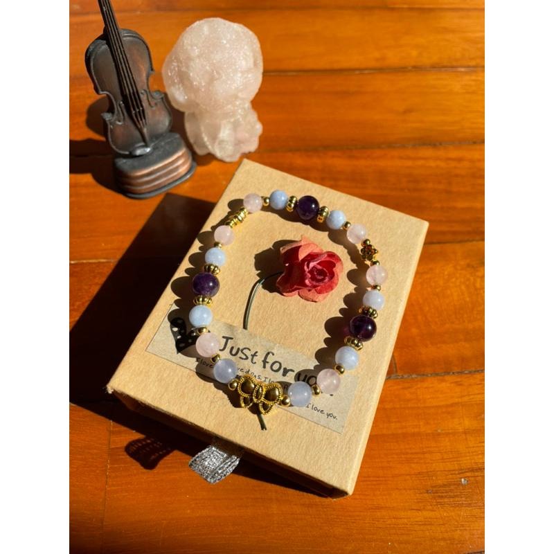 約6mm天然海水藍寶+約8mm紫水晶+約6mm粉晶的雙魚座設計款,手圍約16.3,銀飾為藏銀。