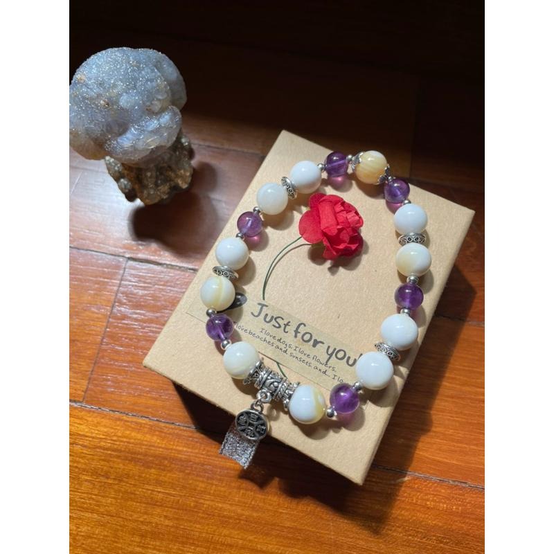 天然約10mm金絲硨磲貝+約8mm紫水晶的處女座設計款,皆無染無優化,手圍約18,佩飾藏銀。