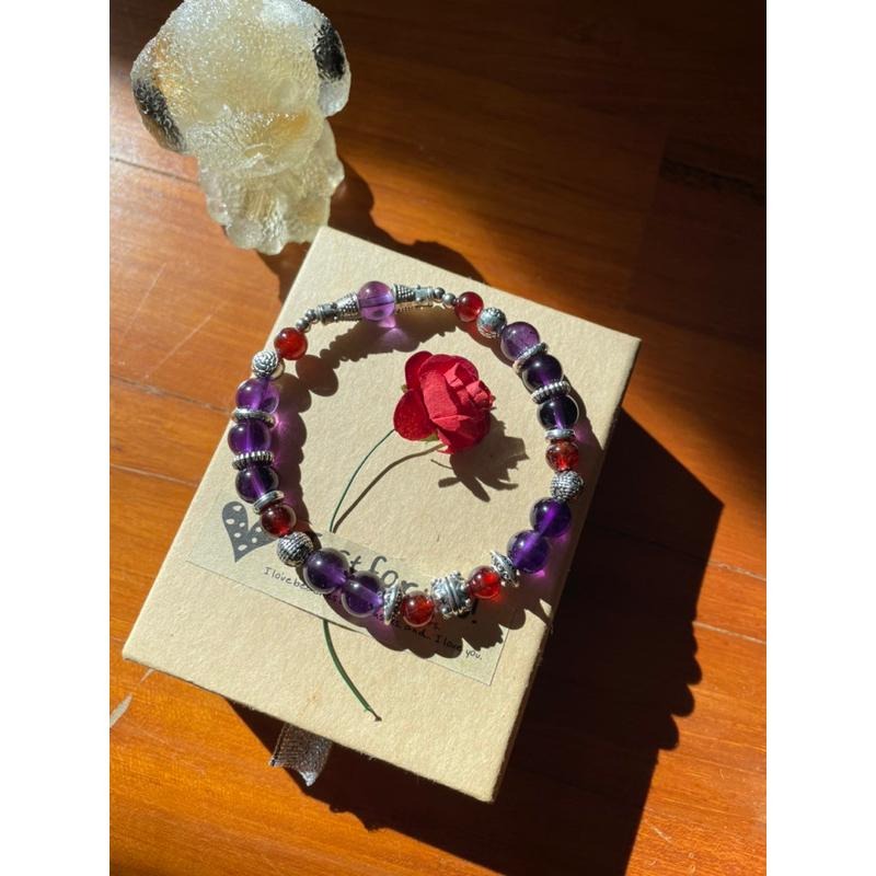 天然約6mm橙石榴+約8mm紫水晶的牡羊座設計款,皆無染無優化,手圍約16.4,佩飾藏銀。