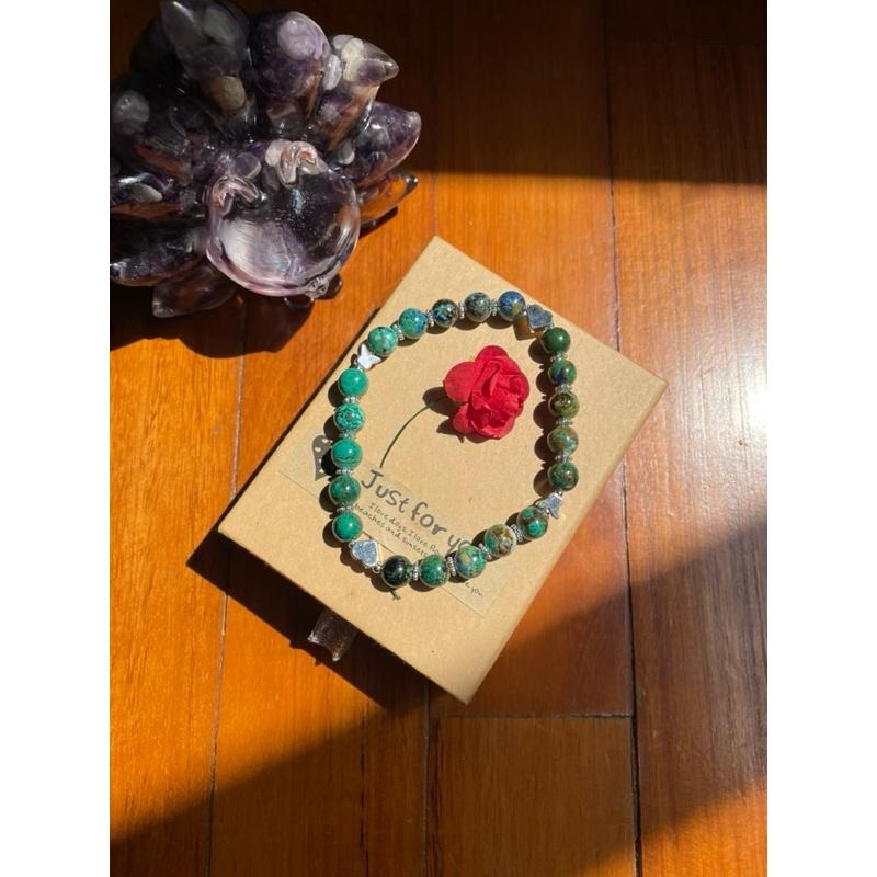 天然約7mm藍銅礦孔雀石共生的設計款手鍊,選多孔雀石共生的珠子,手圍約17.1,配飾為銅鍍18k金。 本賣場水晶採自然光,拍照不打光,若有手圍問題請私訊,如有其他問題也請私訊我喔:)