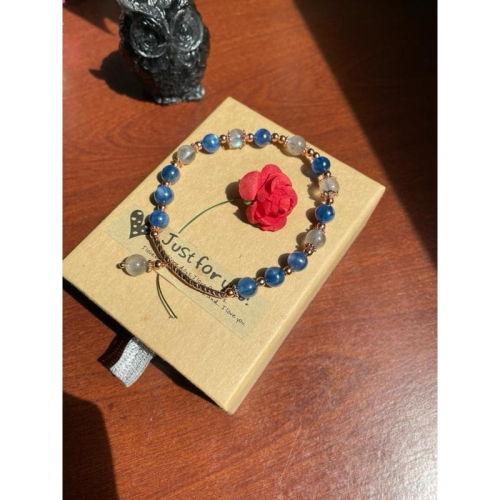 天然約6.8mm拉長石+約6.5mm藍晶石的設計款手鍊,手圍約16.4,配飾為銅鍍k金。