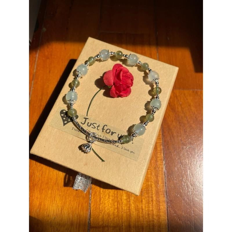 天然約7mm綠柱石+約5mm綠磷灰石的設計款手鍊,手圍約16.6,配飾為銅鍍18k金。
