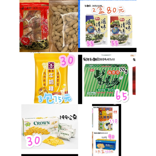 燕麥、海鹽蘇打、紫菜湯、crown蘇打、牛奶糖、真好家海帶芽 110+100+65+30++75+80+40=500元