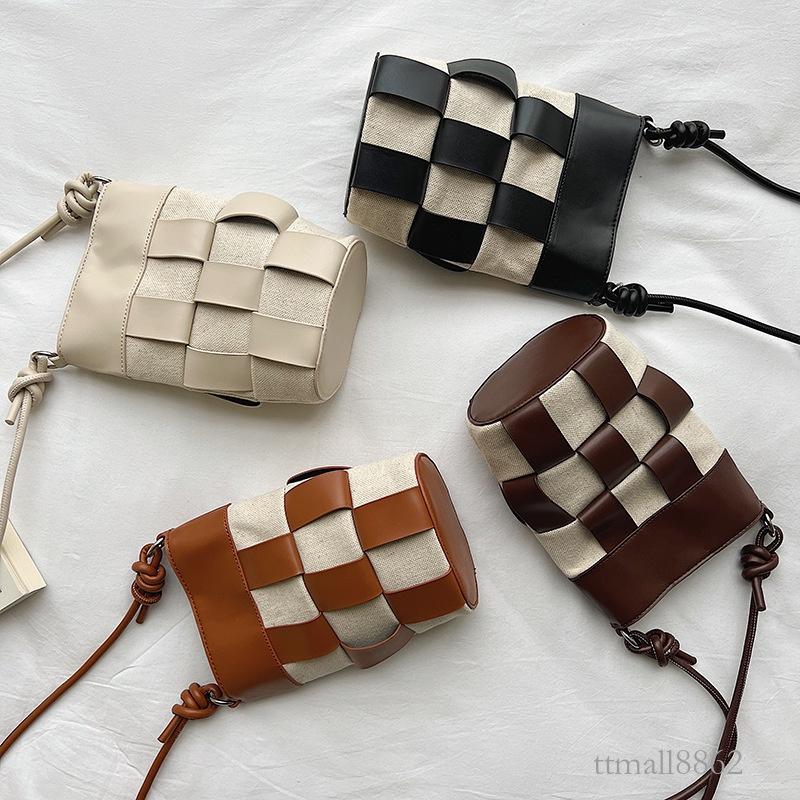 BAGG👾 帆布拼接PU格子水桶包女時尚韓版肩背包個性潮流小眾女 時尚包 休閒百搭包包 母親節禮物